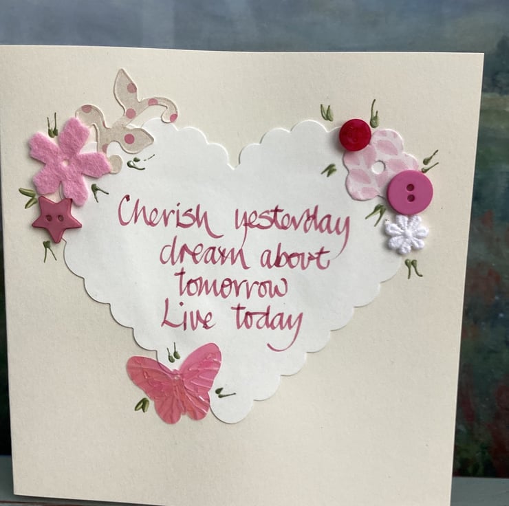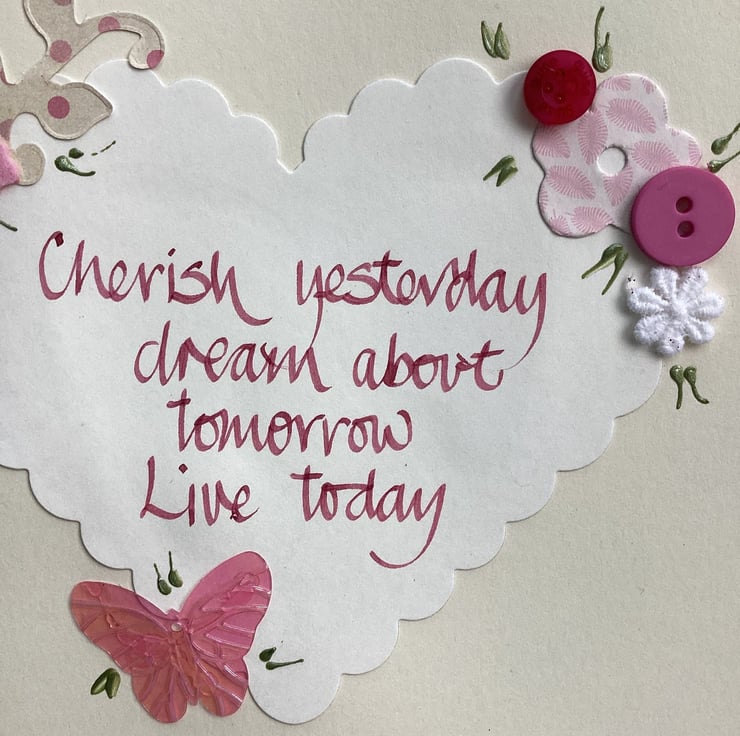 Cherish yesterday, dream about tomorrow, live today.Handwritten words onto a heart which is embellished with felt,paper,buttons.