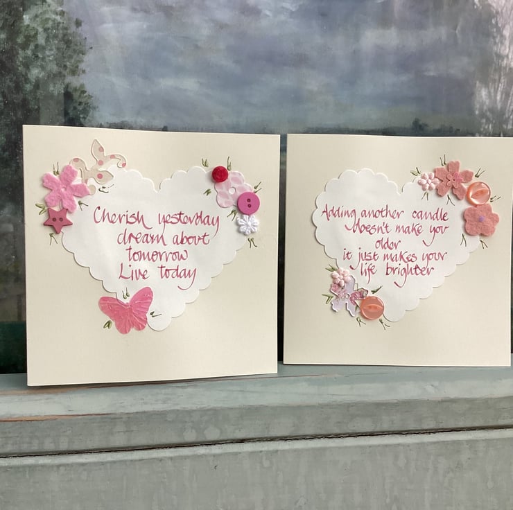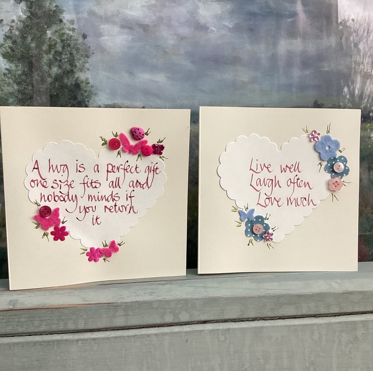 The cards are handwritten calligraphy and embellished with flowers and buttons.