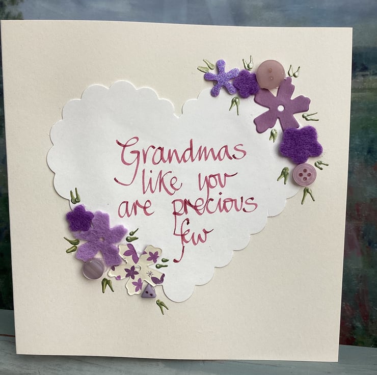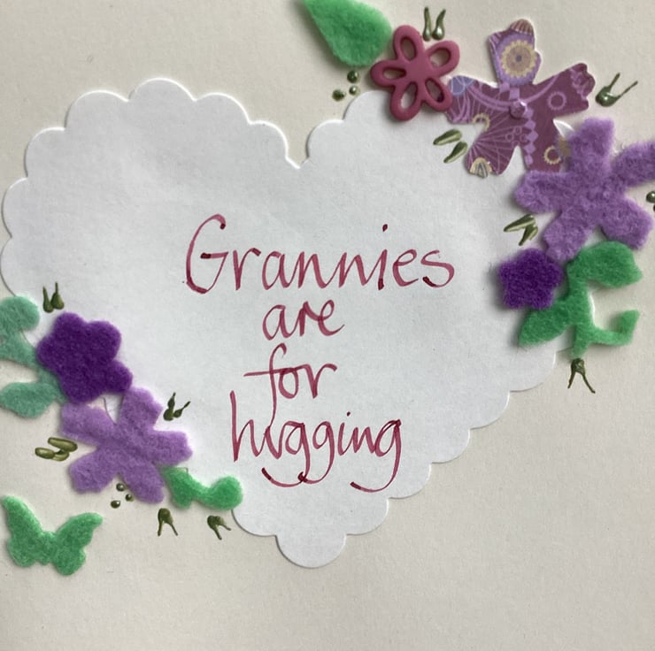 Grannies are for hugging.Handwritten words onto a heart which is embellished with felt,paper,buttons.