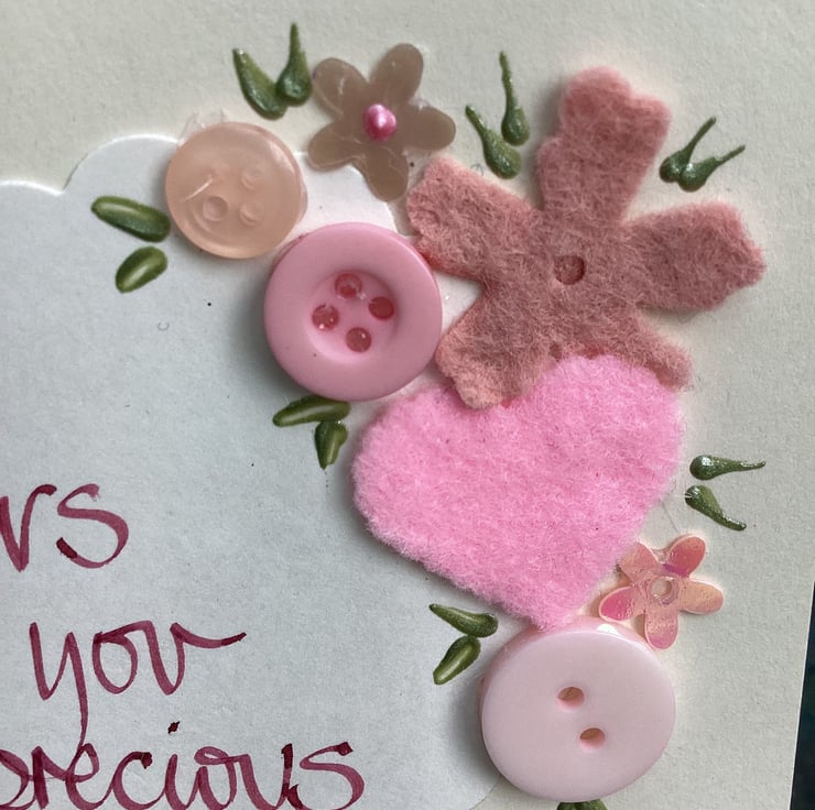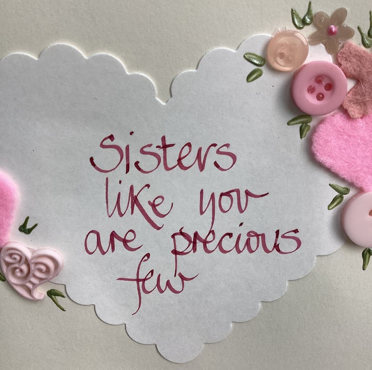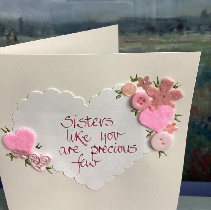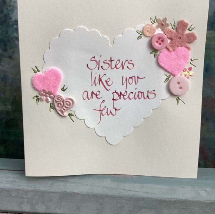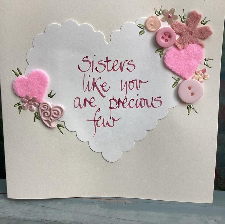 Sisters like you are precious few.Handwritten words onto a heart which is embellished with felt,paper,buttons.