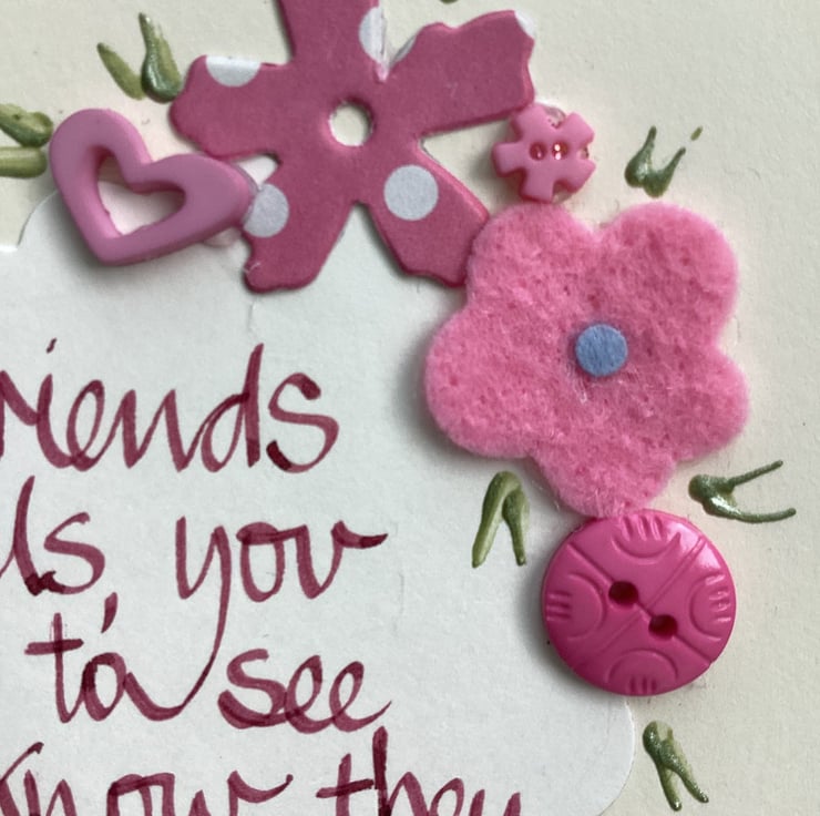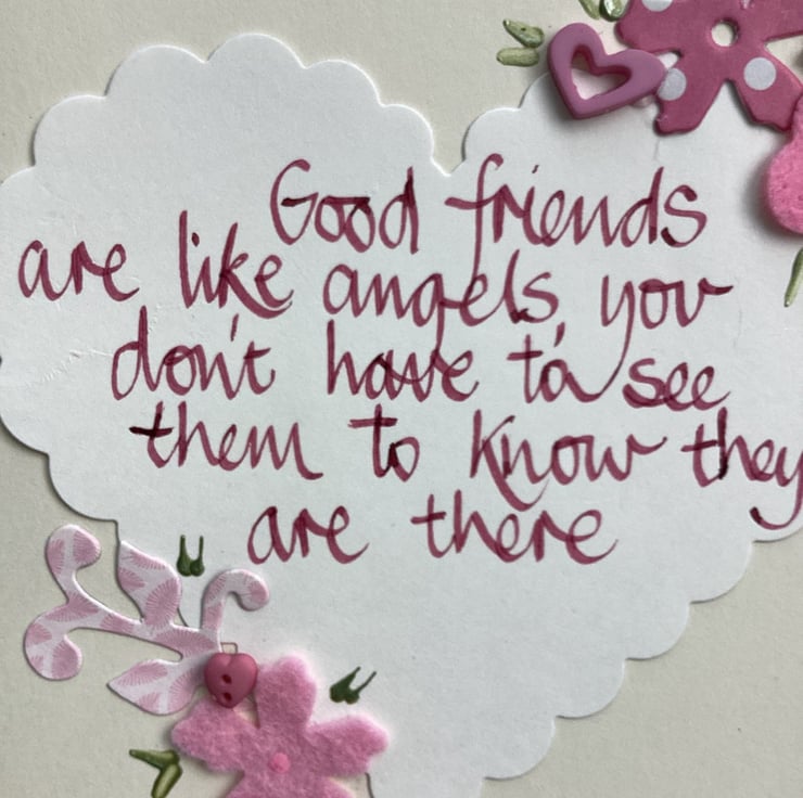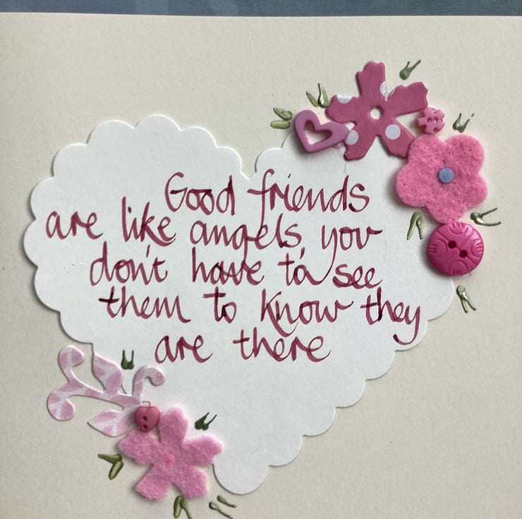 Good friends are like angels, you don t have to see them to know they are there.Handwritten words onto a heart which is embellished with felt,paper,buttons.