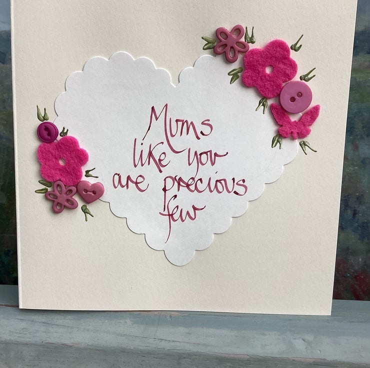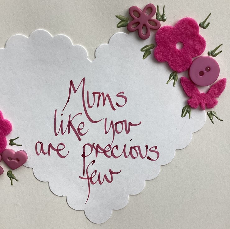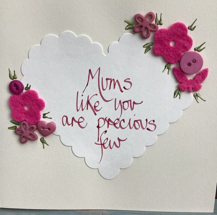 Mums like you are precious and few.Handwritten words onto a heart which is embellished with felt,paper,buttons.