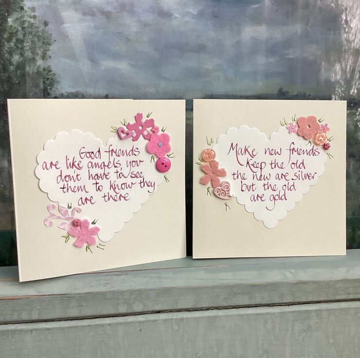 The cards are handwritten calligraphy and embellished with flowers and buttons.