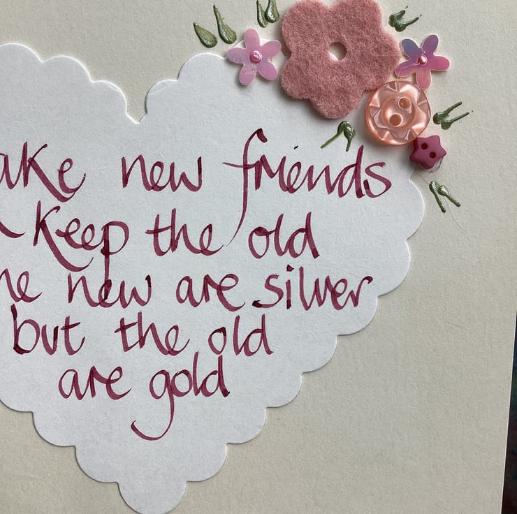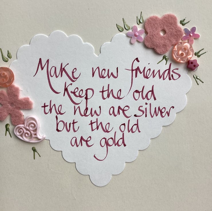 Make new friends, keep the old, the new are silver, but the old are gold. Handwritten words onto a heart which is embellished with felt,paper,buttons.