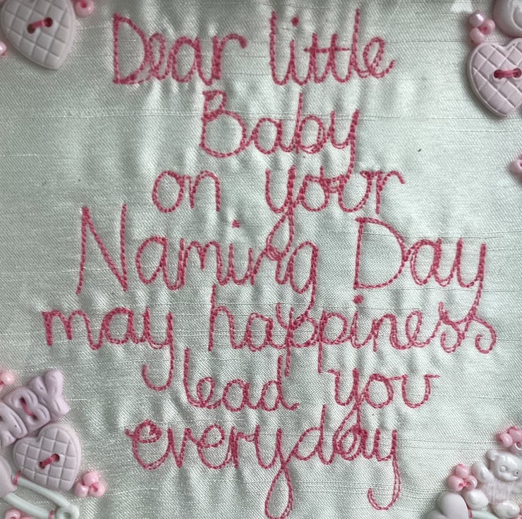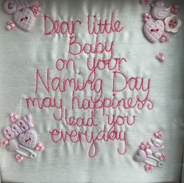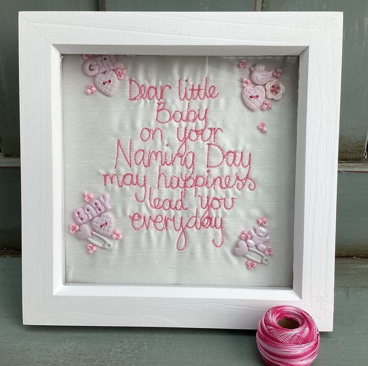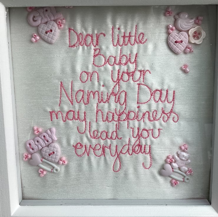 Dear little baby on your Naming day ,may happiness lead you every day.Machine embroidered and hand embellished with pink buttons and beads.In a square shadow box frame. Size 18cm .FREE POSTAGE in UK.