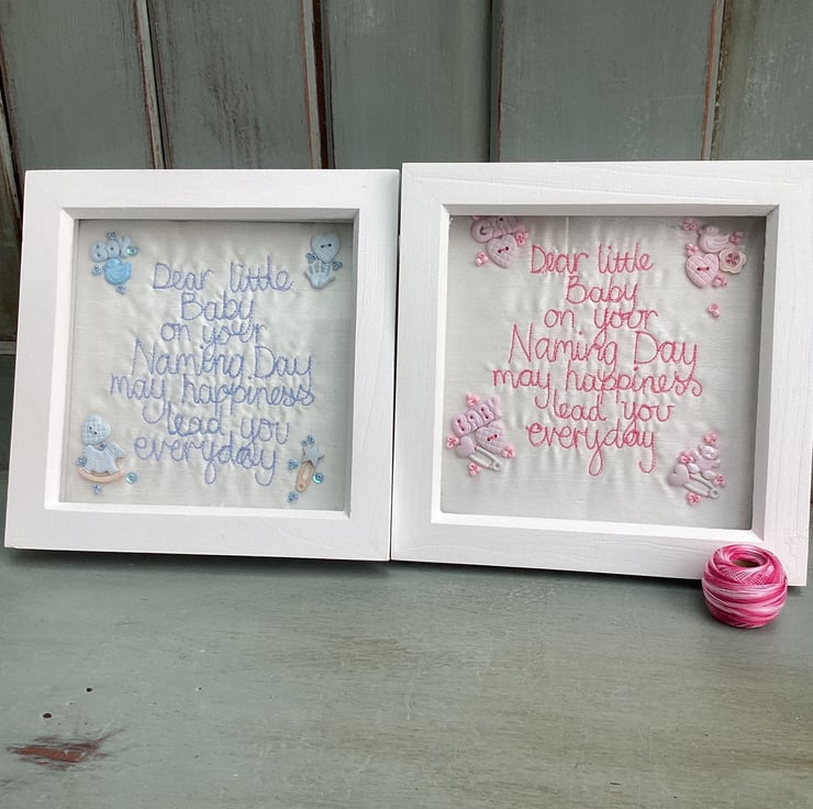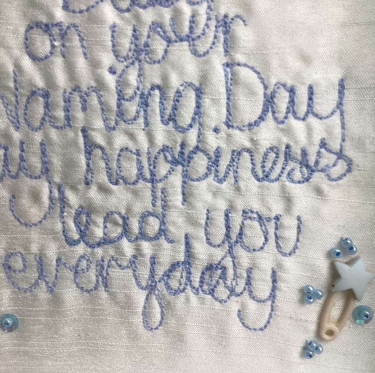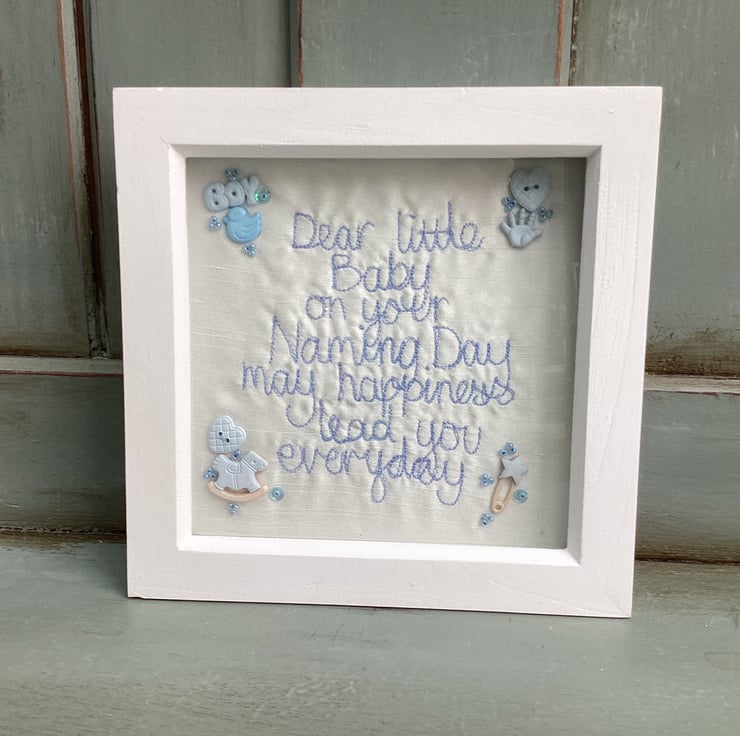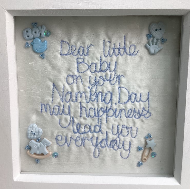 Dear little baby on your Naming day ,may happiness lead you every day.Machine embroidered and hand embellished.In a shadow box frame size 18cm sq.Blue.