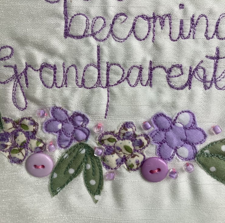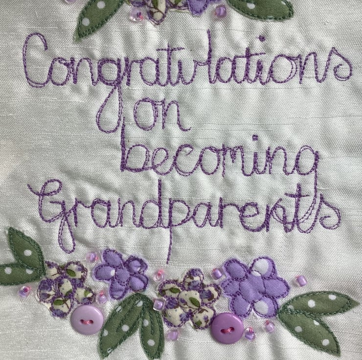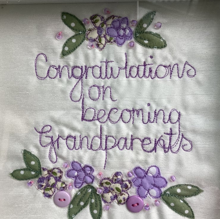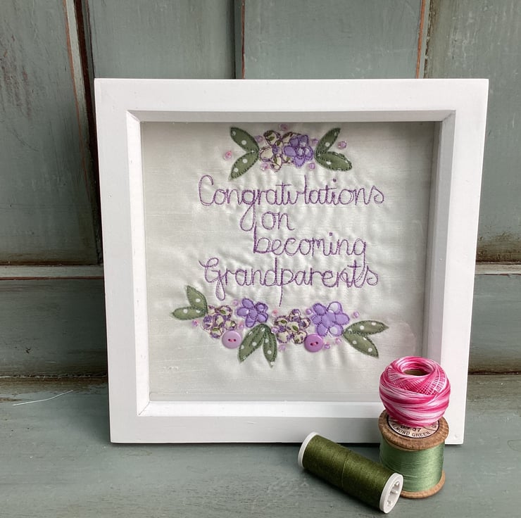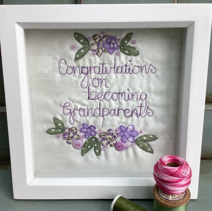 Congratulations on becoming Grandparents.Machine embroidered and hand embellished with buttons and beads.In a fram square shadow frame size 18cm sq.