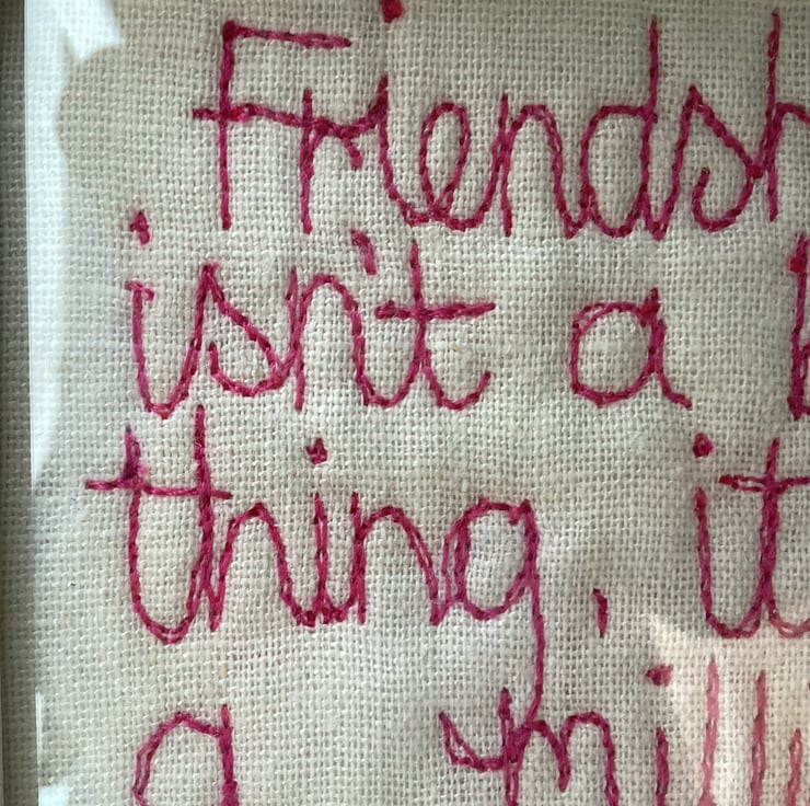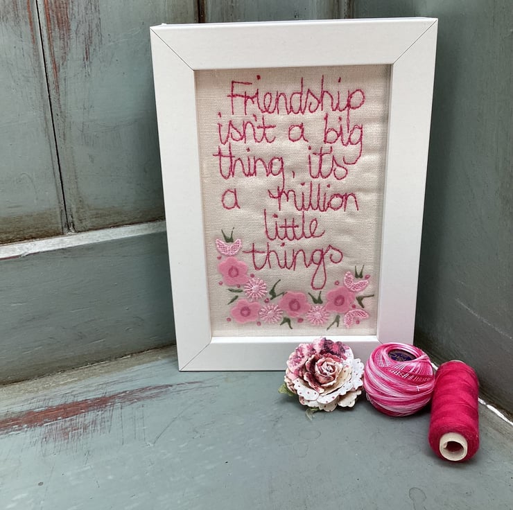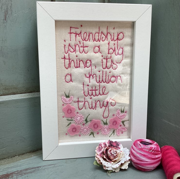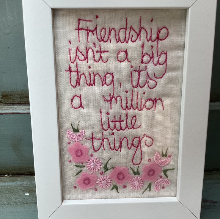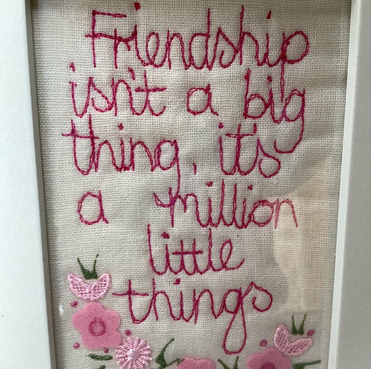 Machine embroidered picture.Celebrate a birthday,or your friend.Embellished with felt flowers.Gold frame size 18 x 14 cm