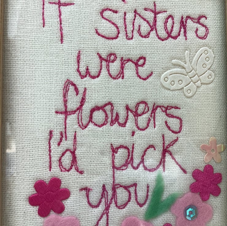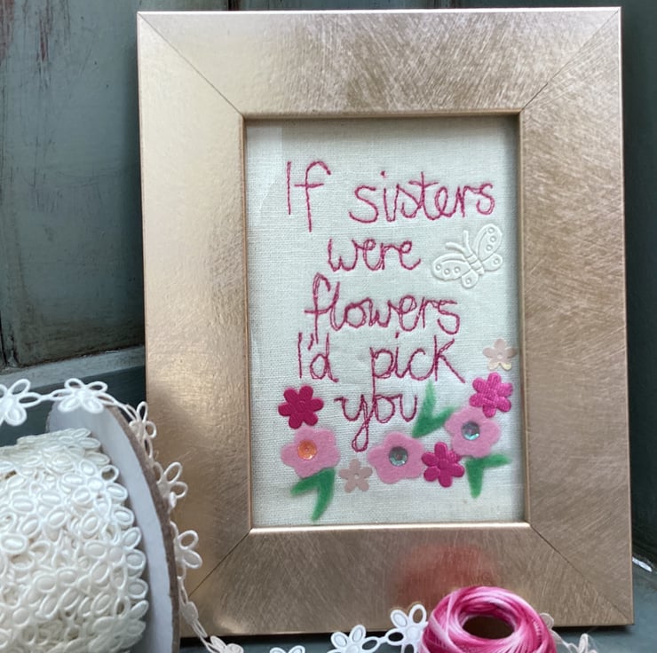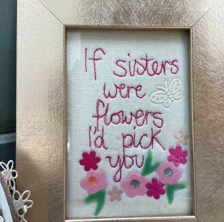 Machine embroidered picture.Celebrate a birthdayand your Sister.Embellished with felt flowers.