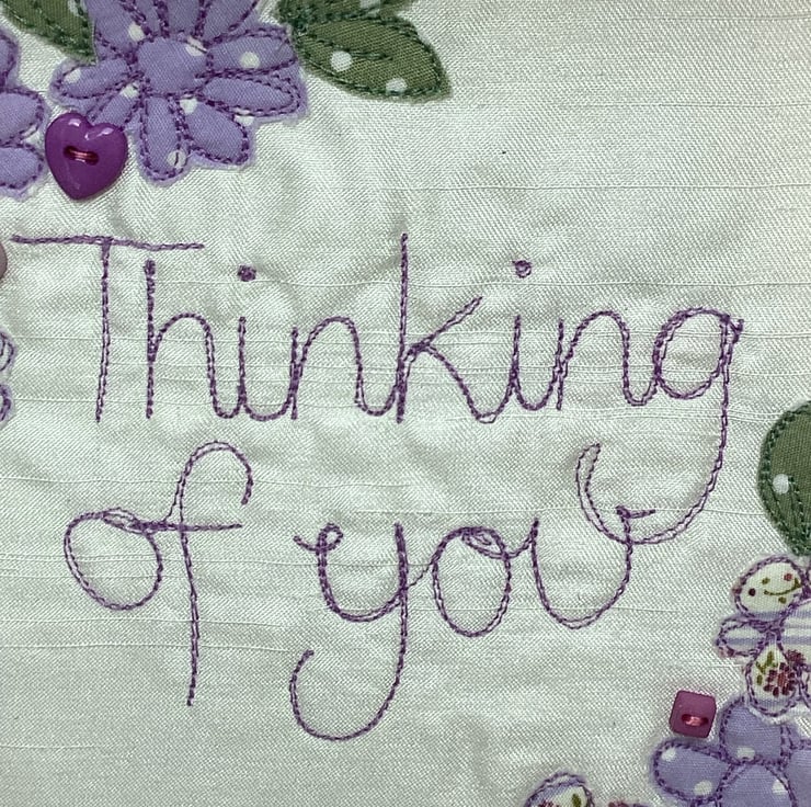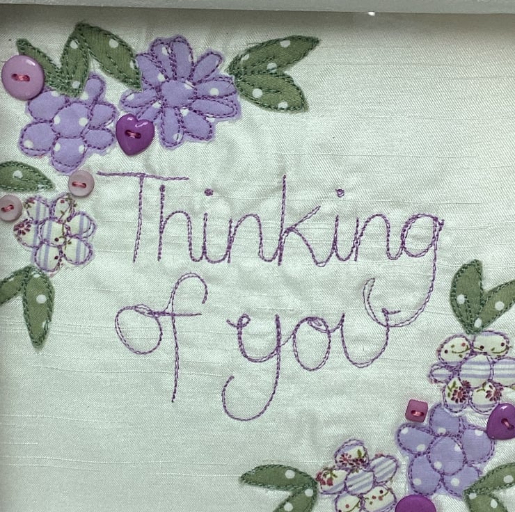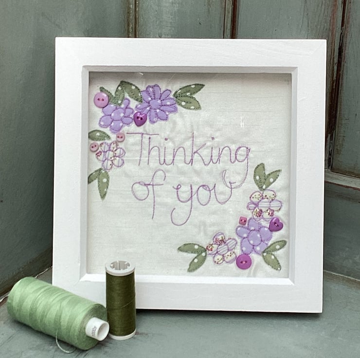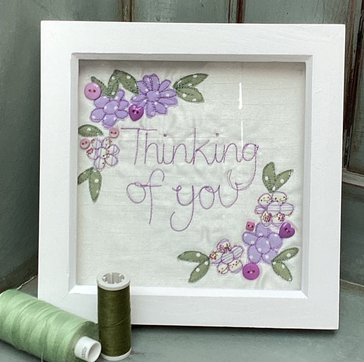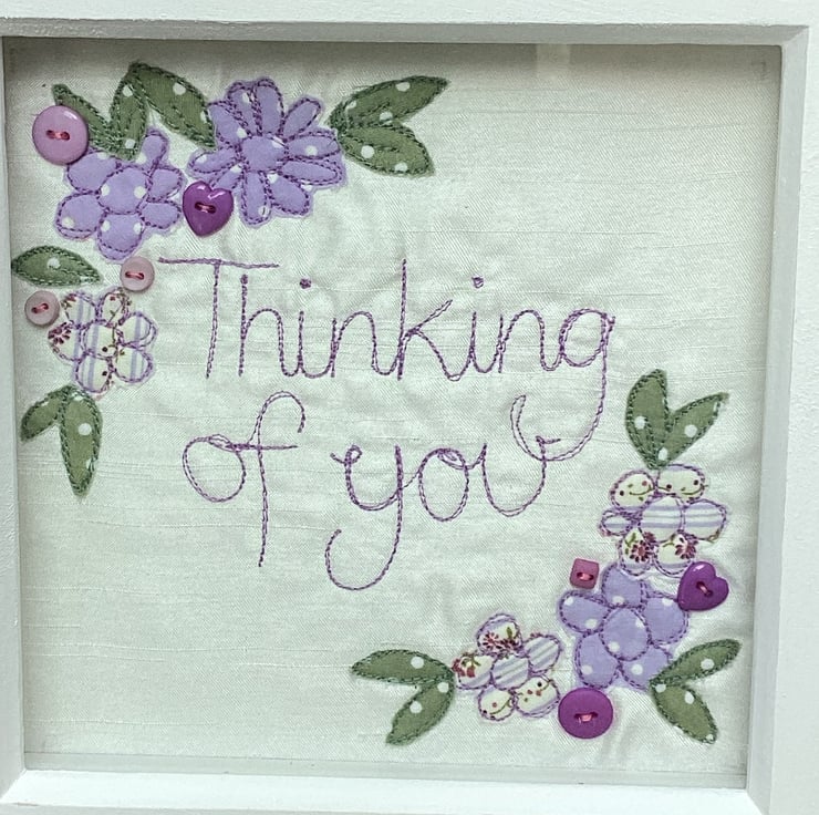 Thinking of you.Machine embroidered and hand embellished with printed cotton fabric.In a shadowbox frame.Frame size 18cm sq.