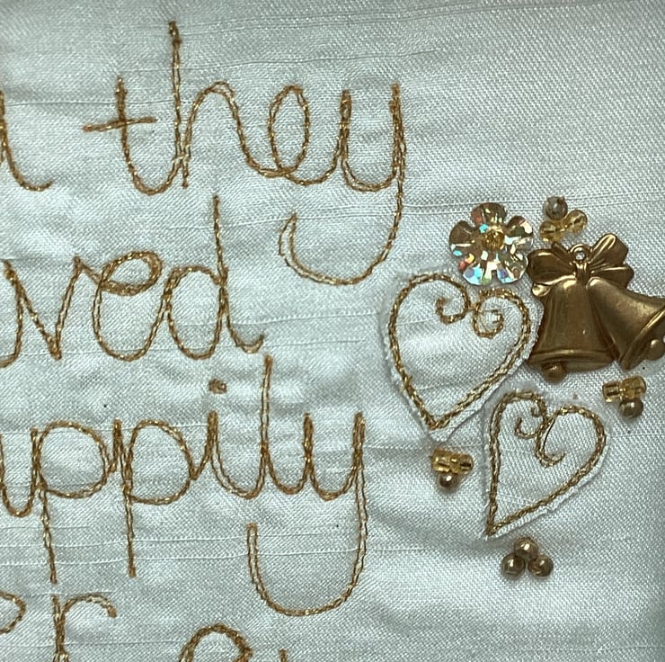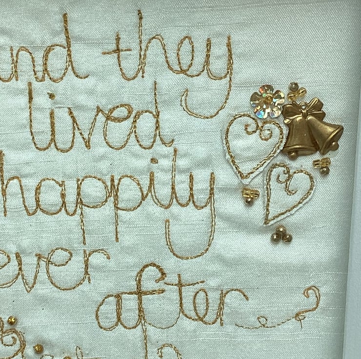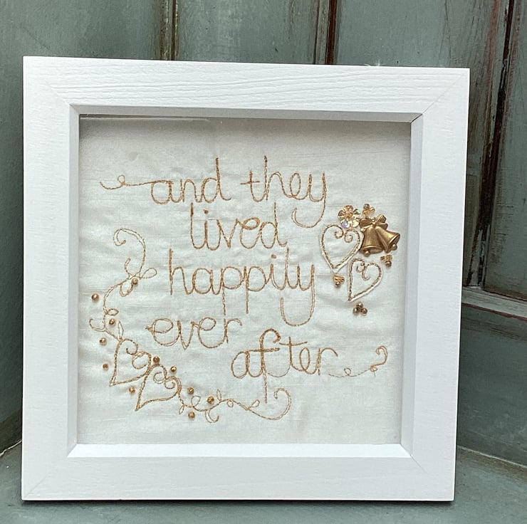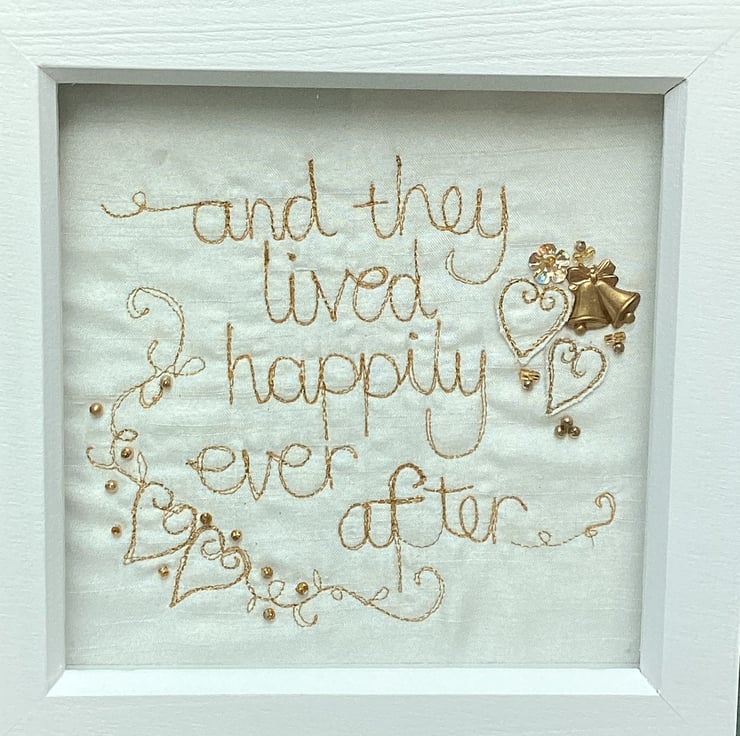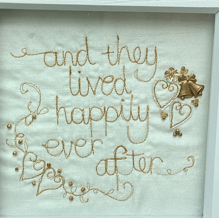 'And they lived happily ever after'.Machine embroidered in metallic thread and hand embellished with button sand beads.In a shadow box frame . Frame size 18cm sq.