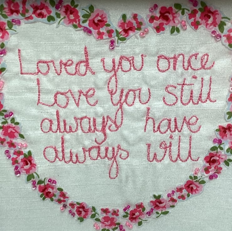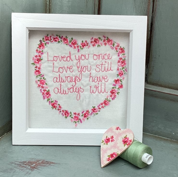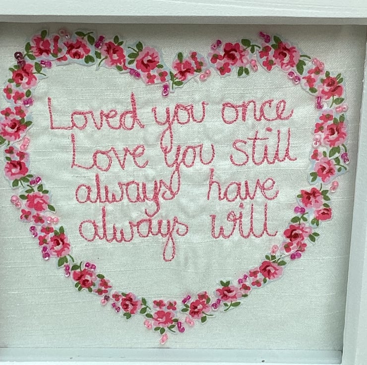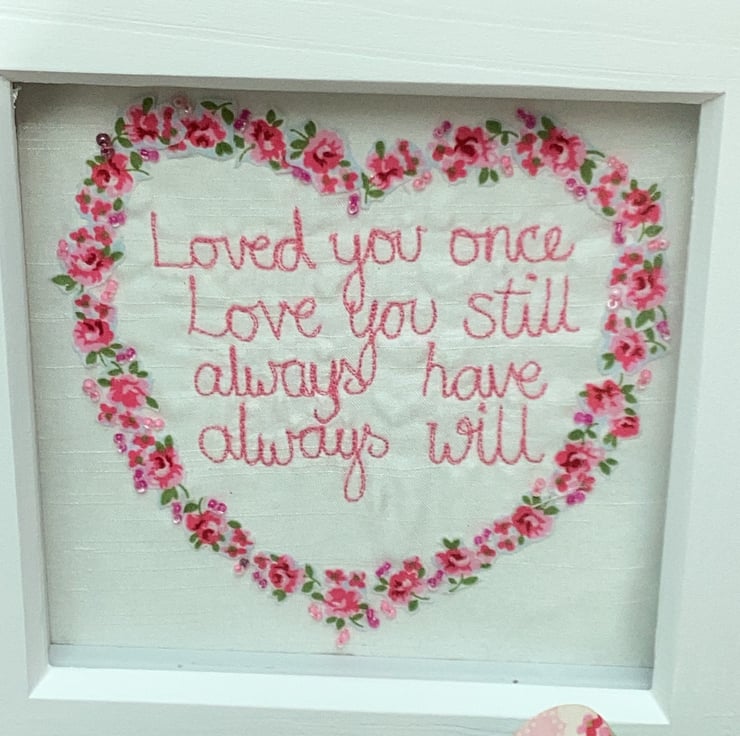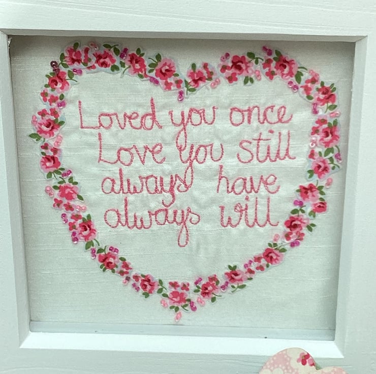 Loved you once, love you still,always have always will.Machine embroidered and hand embellished with buttons and beads.In a shadow box frame,size 18cm.