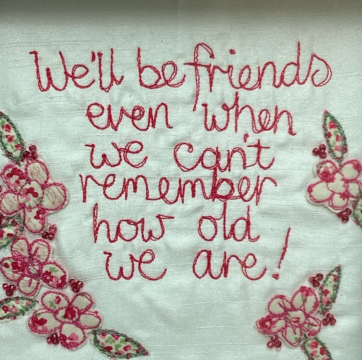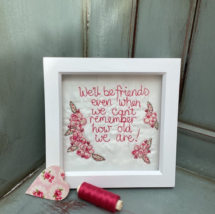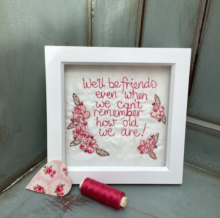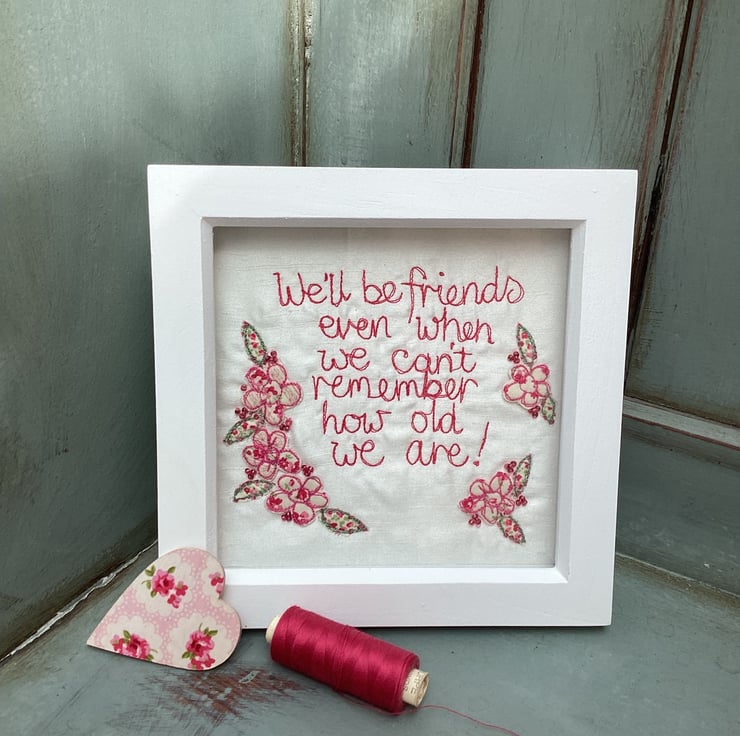 We'll be friends, even when we have forgotten how old we are .Machine embroidered and hand embellished with buttons, beads and .In a shadow box frame,size 18cm.