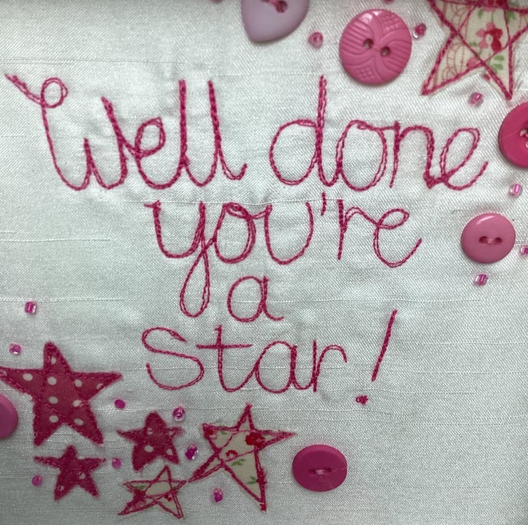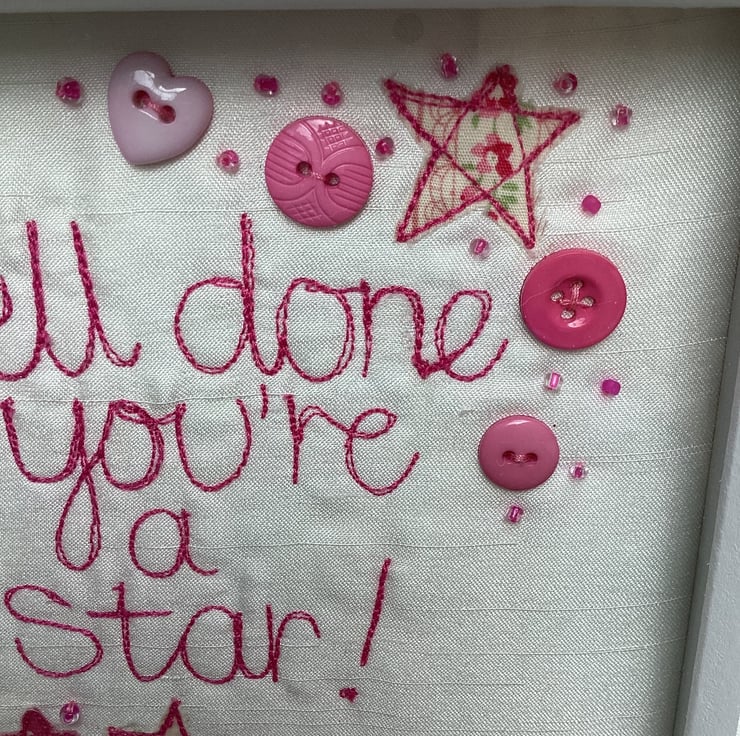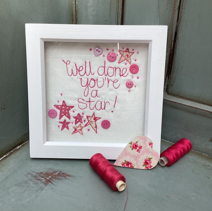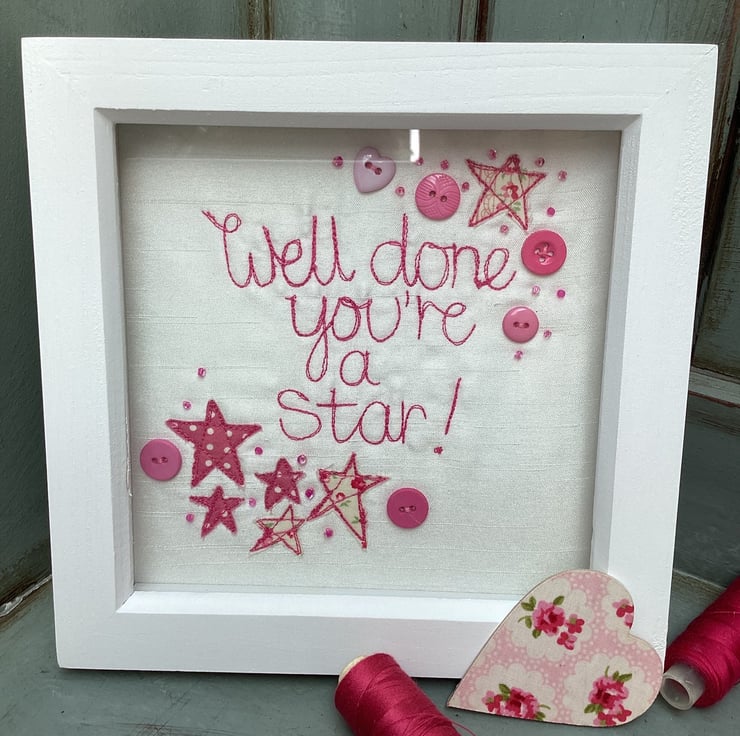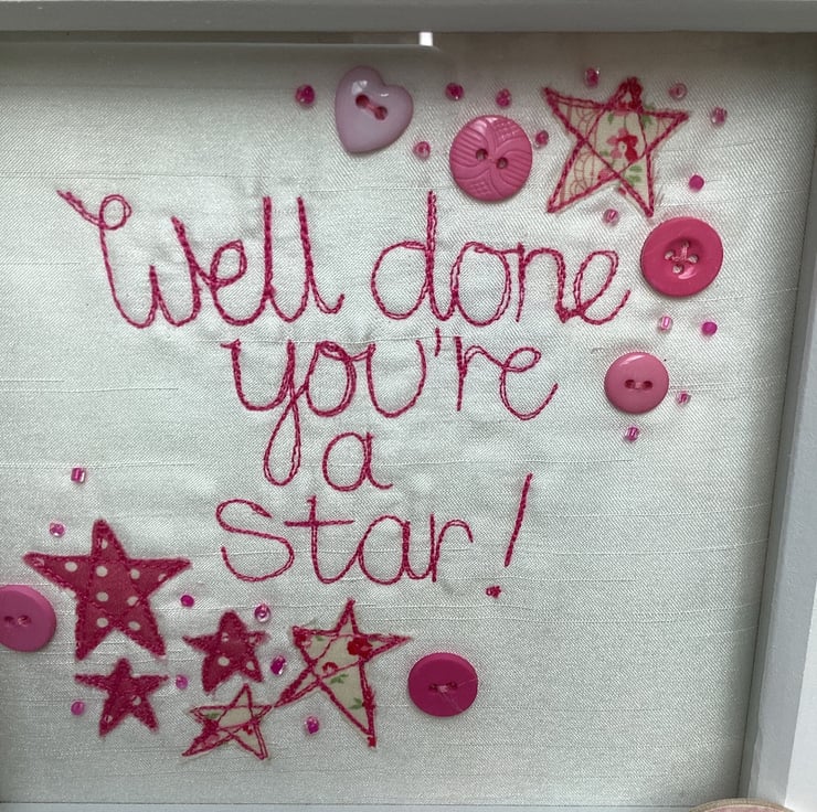Well done, you're a star!.Machine embroidered picture in a frame and hand embellished with beads and appliqued motifs.In ashadow box frame size 18cm.
