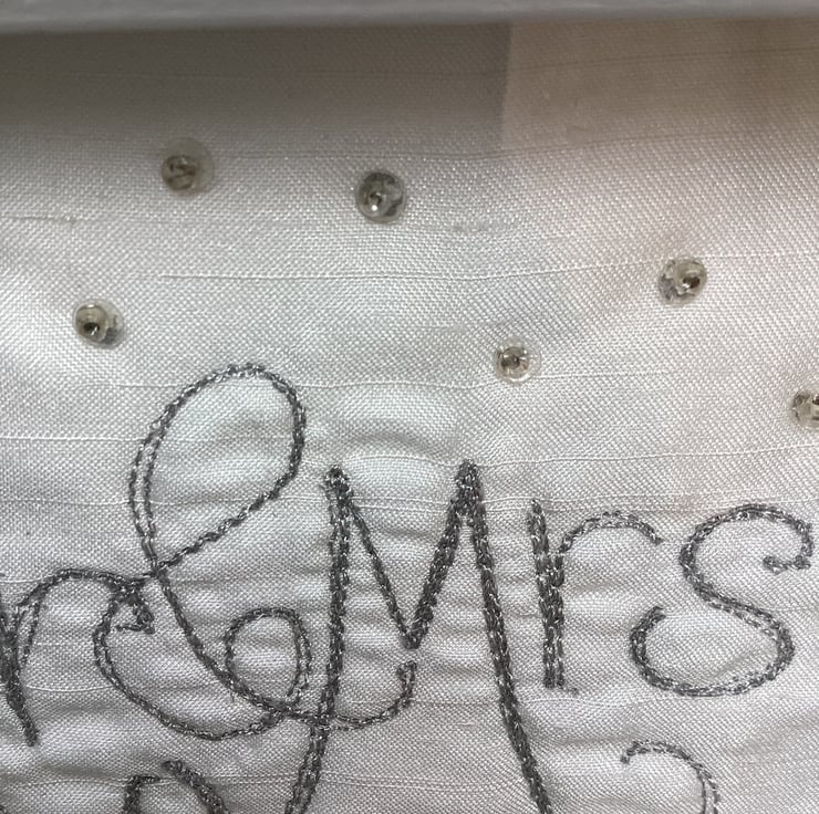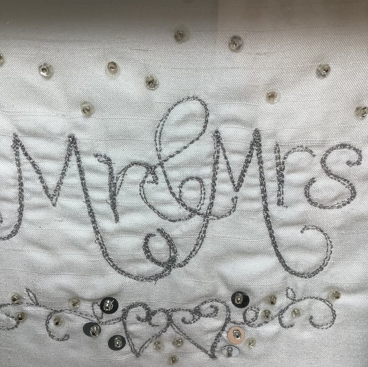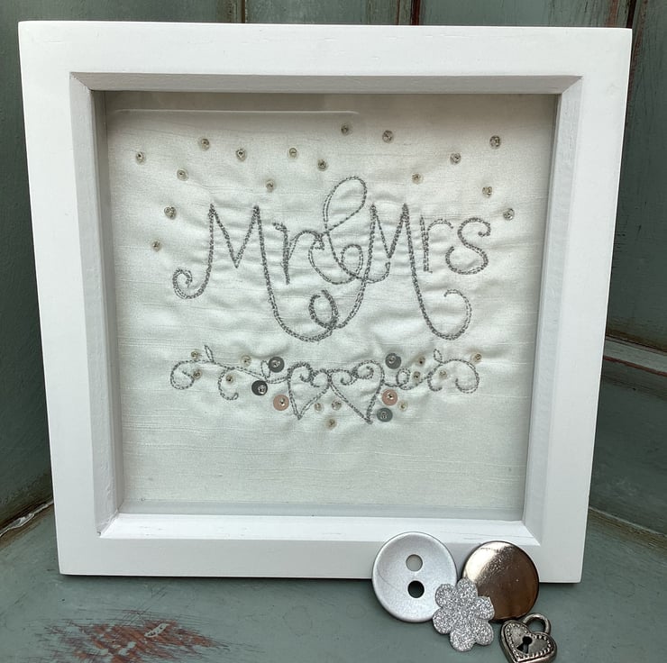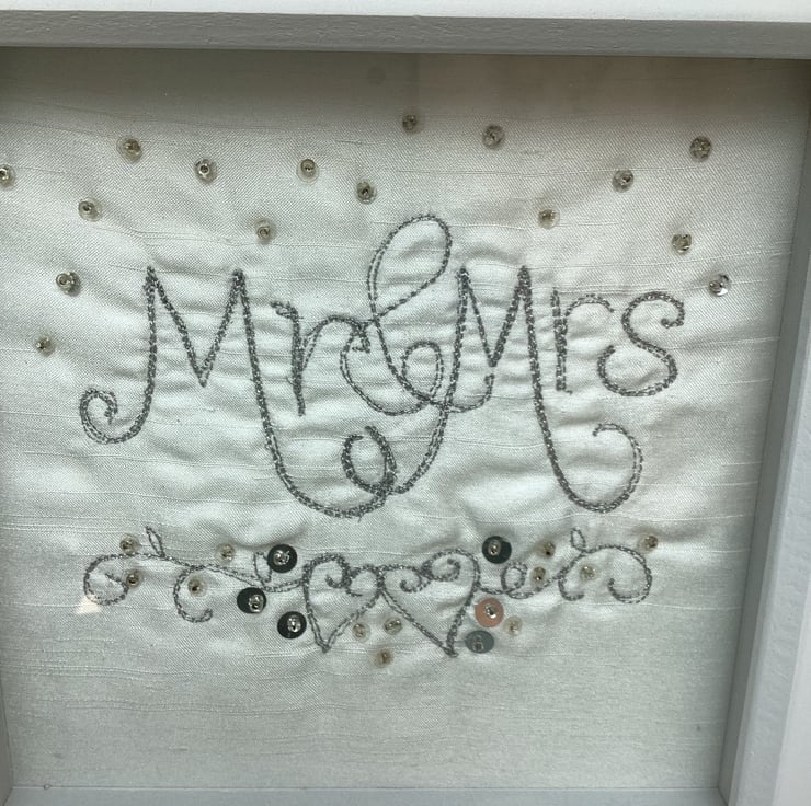 Mr and Mrs Wedding gift.Machine embroidered with silver metallic thread and hand embellished.In a shadow box frame which is 19cm square.