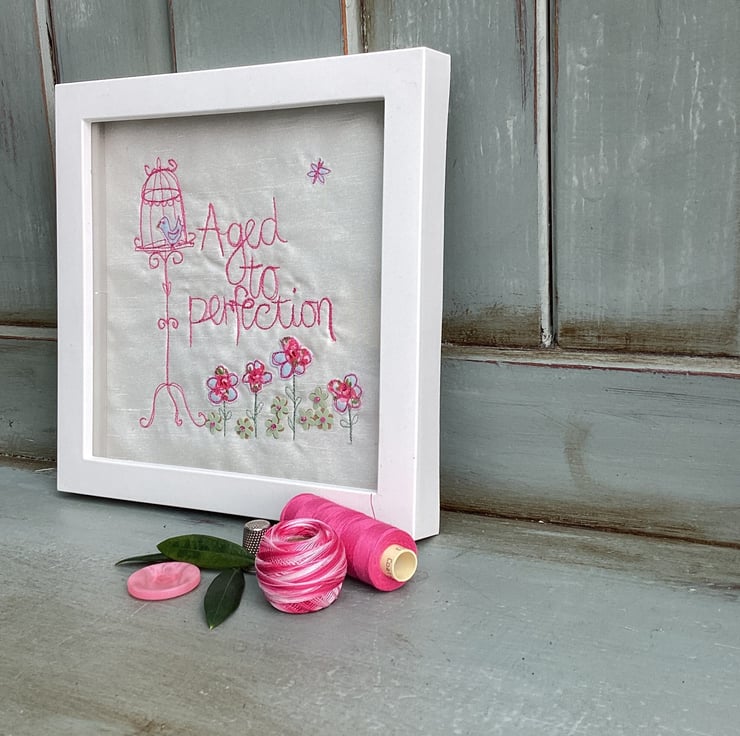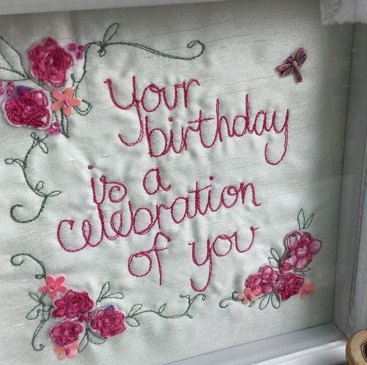 Your birthday is a celebration of you.Freehand embroidered picture for a birthday.Hand sewn embellishments.Mounted into a shadow frame size 19cm.Gift wrapped and a gift message can be added.