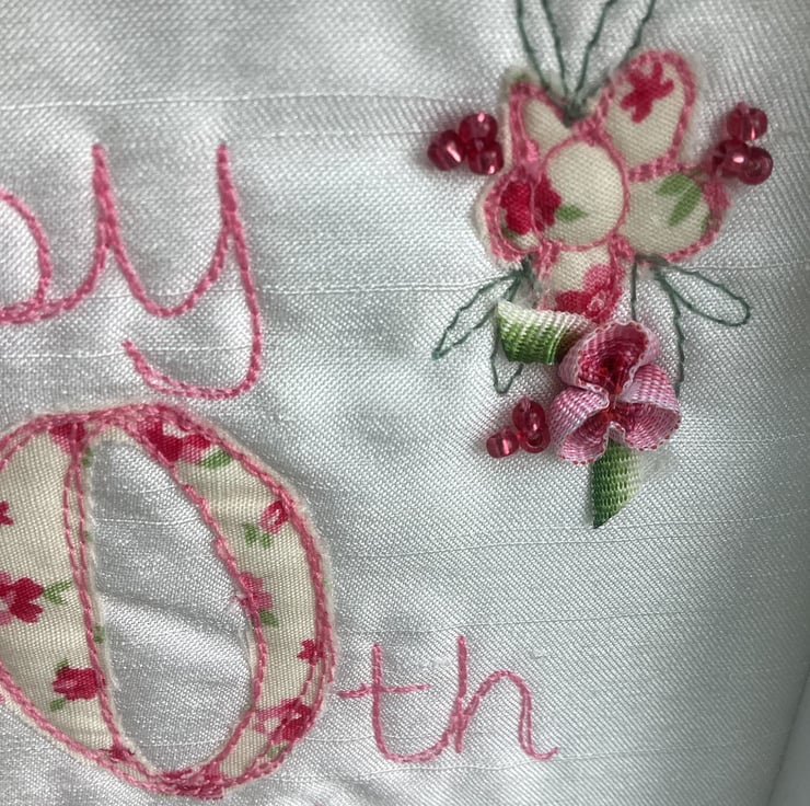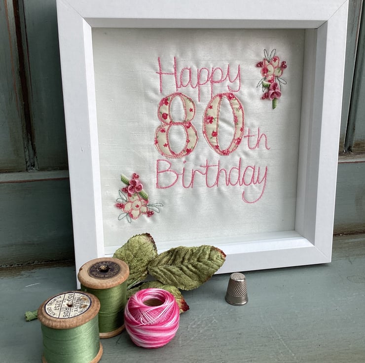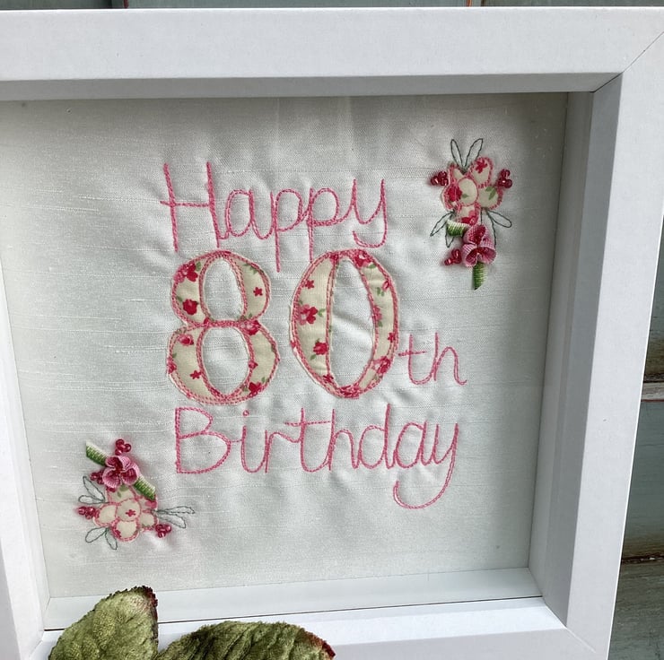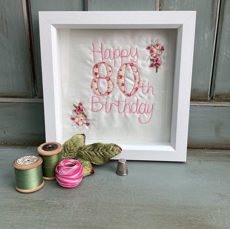 Freehand machine embroidery 80th birthday picture. Hand sewn embellishments.Mounted into a shadow box frame size 19cm.Gift wrapped and can add a gift message too!
