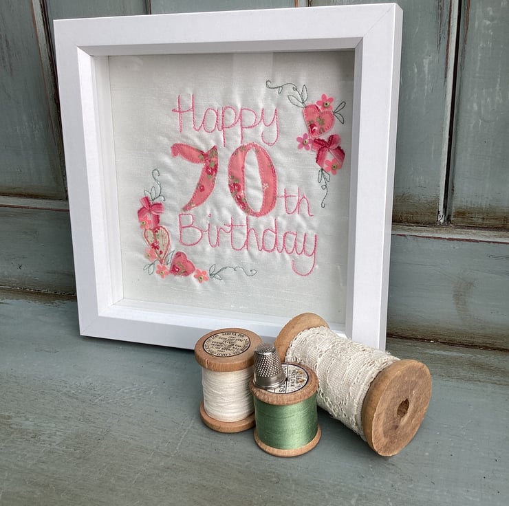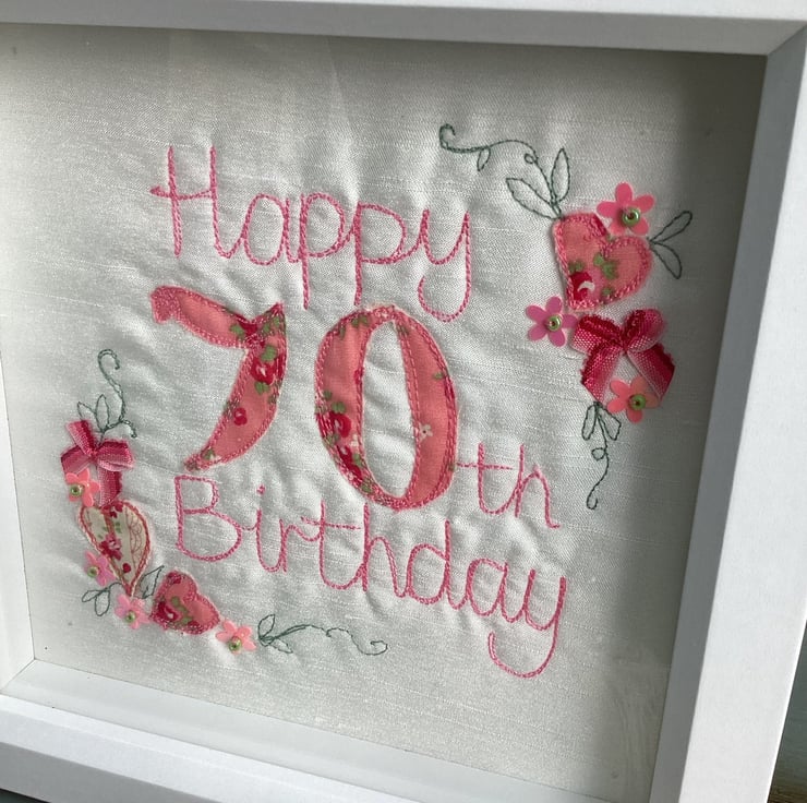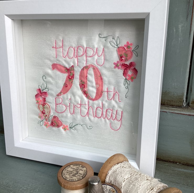 Happy 70th birthday message ,machine embroidered and hand sewn embellishments.Mounted on a shadow box frame, and gift wrapped. Can add a gift message.