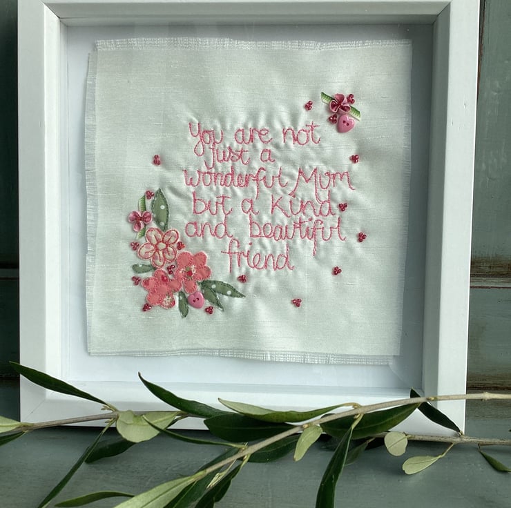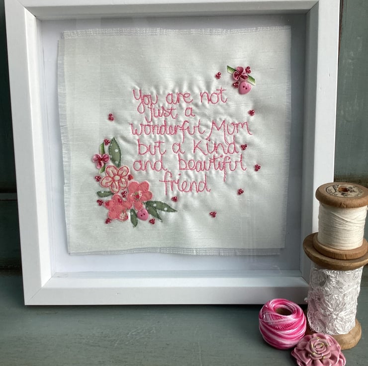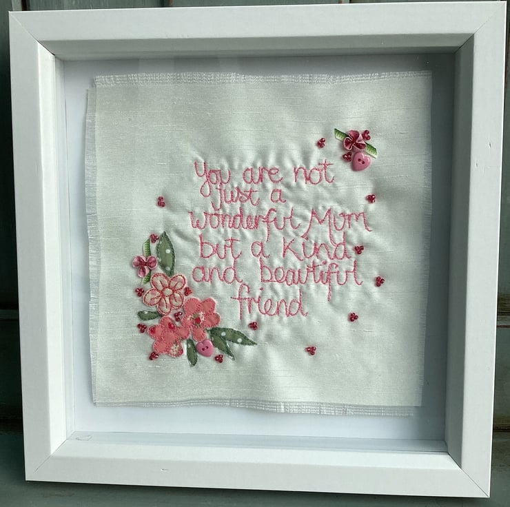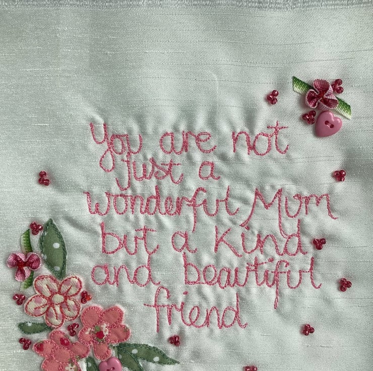 Freehand machine embroidered picture.Using the needle like a pen , l write the words.The fabric is held tight in a hoop, to move it across the Ivory shantung.Embellishments are added by hand.Buttons, beads, sequins etc.