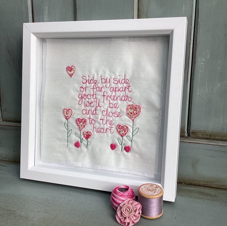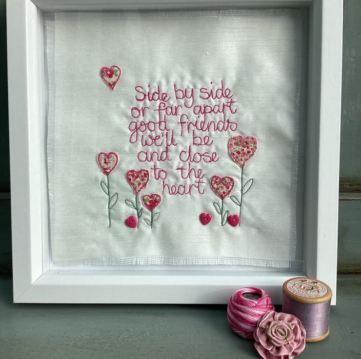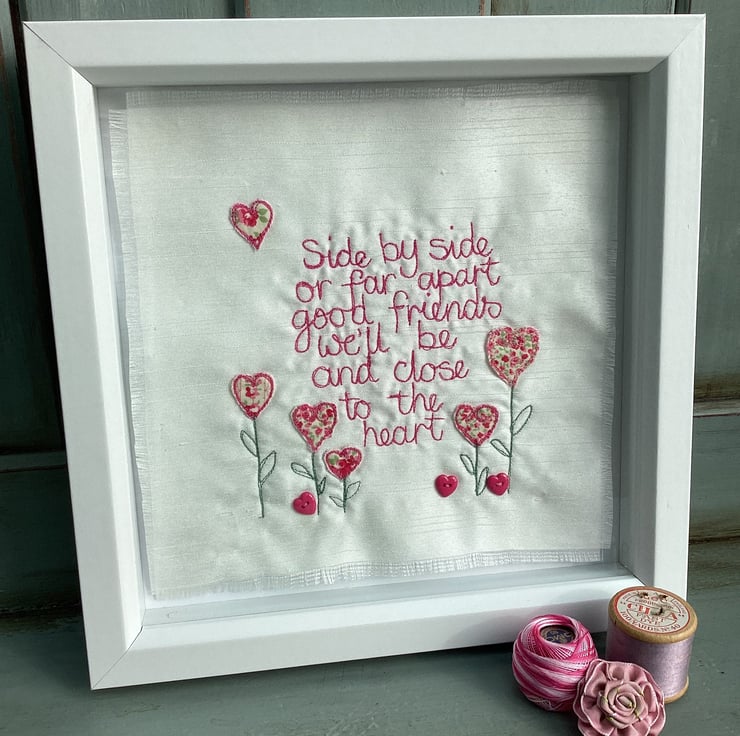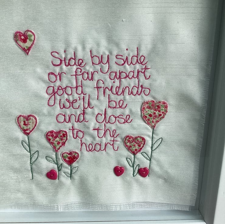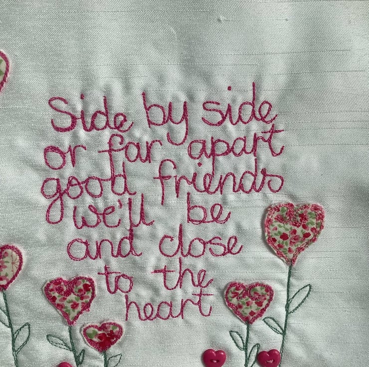 Machine embroidered picture. Using the machine needle like a pencil, I write the words onto Ivory shantung fabric, appliqued motifs , added by hand.