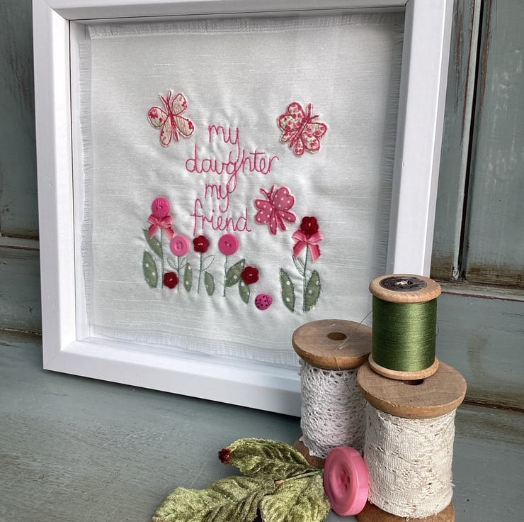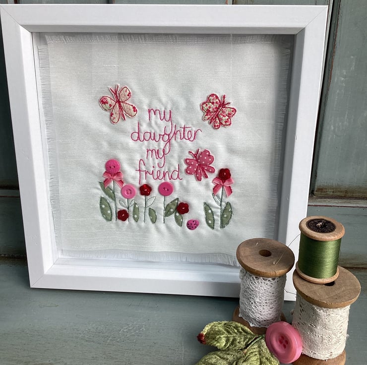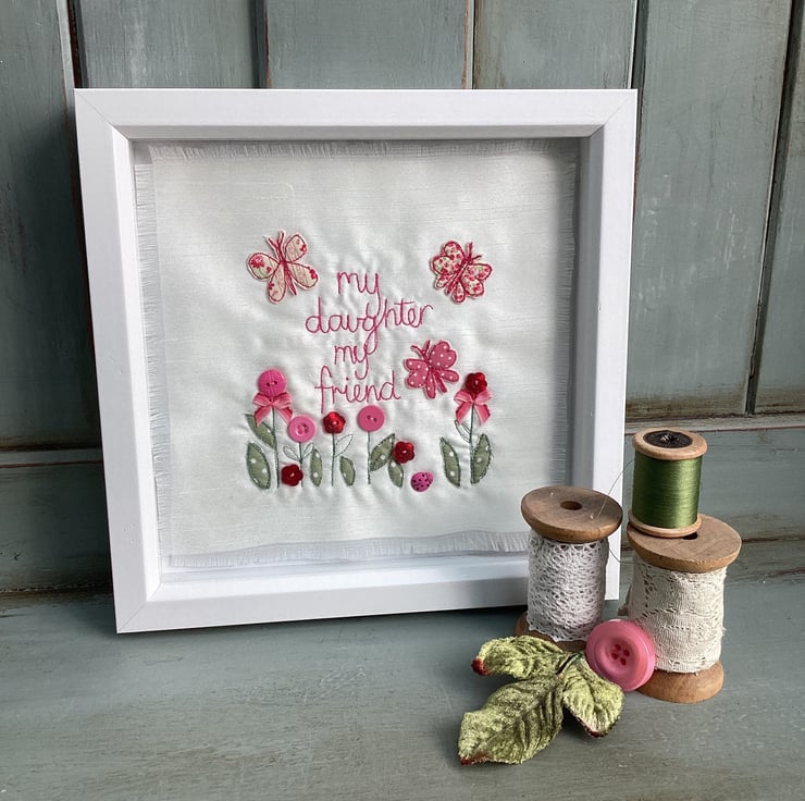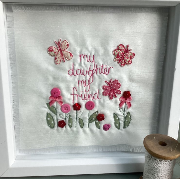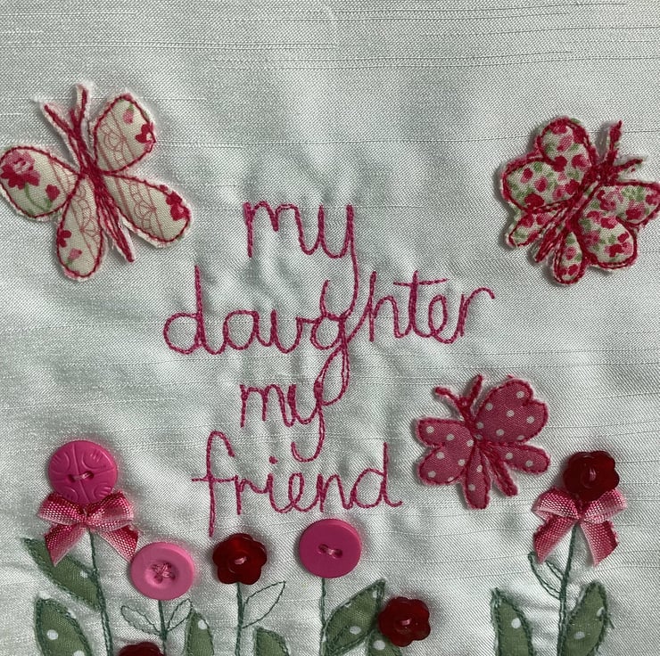 My daughter my friend picture which has been freehand machine embroidered. The buttons and butterflies hand sewn to finish the picture.