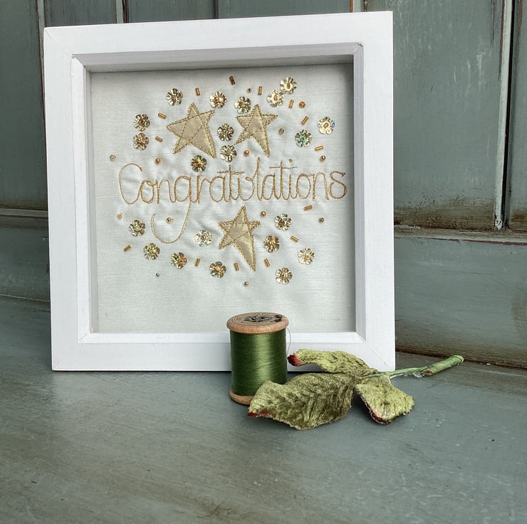 Congratulations gift.Machine embroidered and hand embellished with metallic fabric, sequins and beads..In a white shadow box frame.