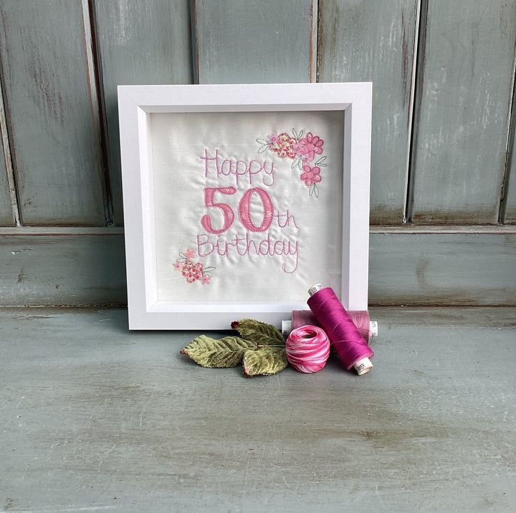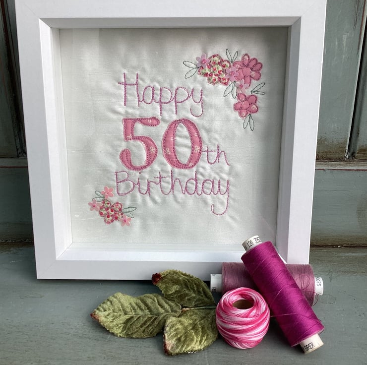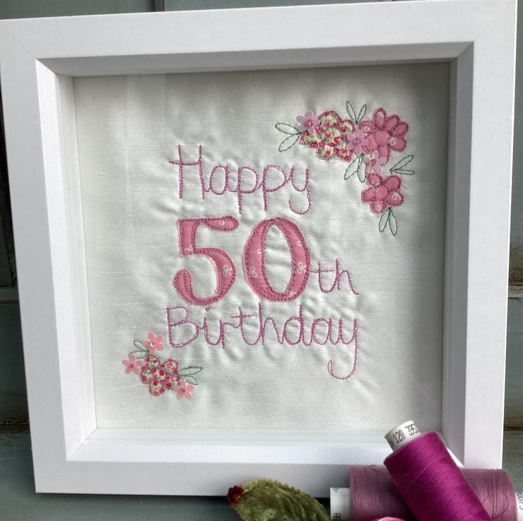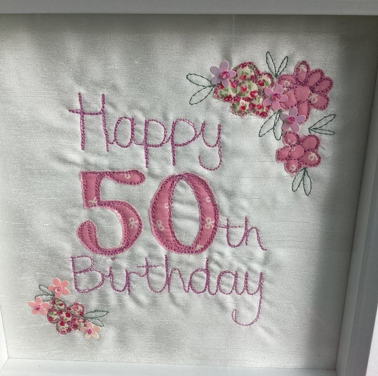 Free hand machine embroidery.Happy 50th Birthday embroidered picture.Flowers and beads sewn by hand.
