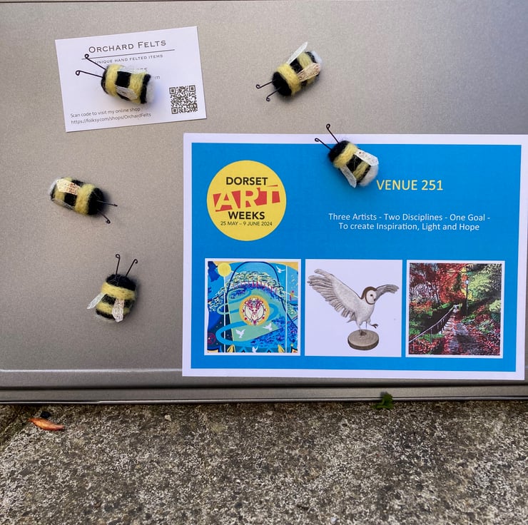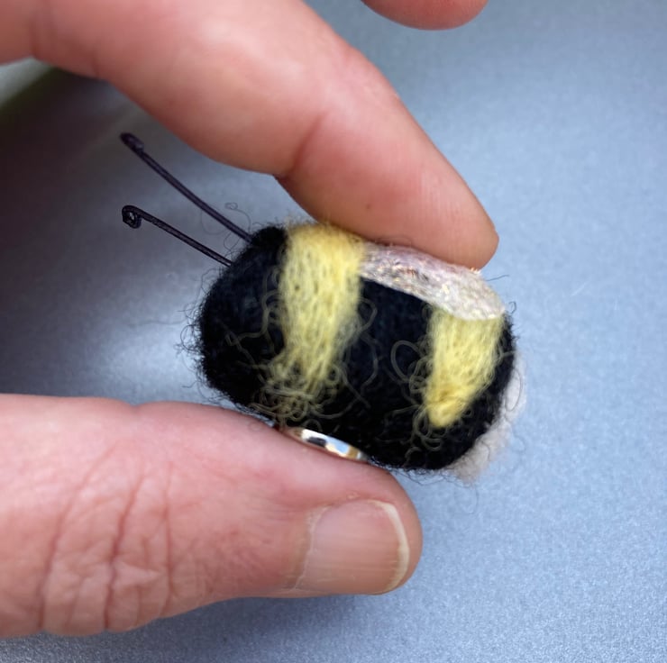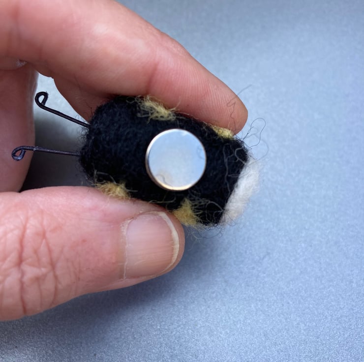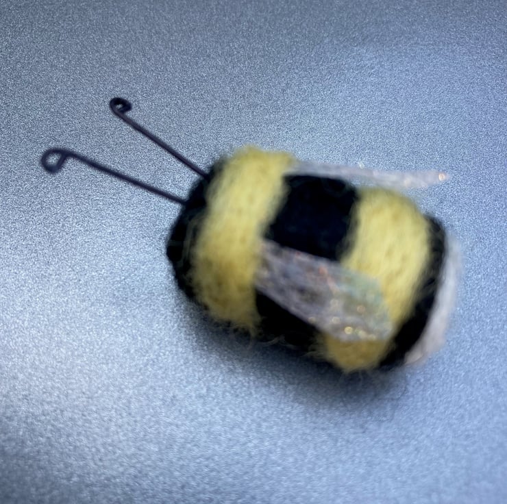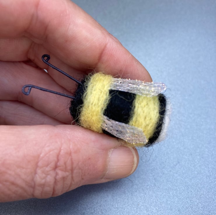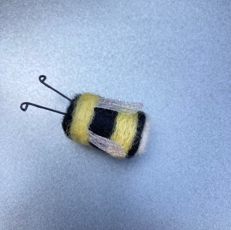 A cute little needle felted bee fridge magnet made from woollen fibres. The bee has a black body, white tail end and yellow stripes. Wings made from iridescent Angelina fibres and black wire antennae have been added. A small but strong magnet has been attached to the base of the bee allowing it to be used as a fridge magnet. The bee measures approximately 3cm in length (excluding antennae) and the magnet is strong enough to hold a couple of sheets of paper, a business card or party invitation. It can also be used as a decorative item.