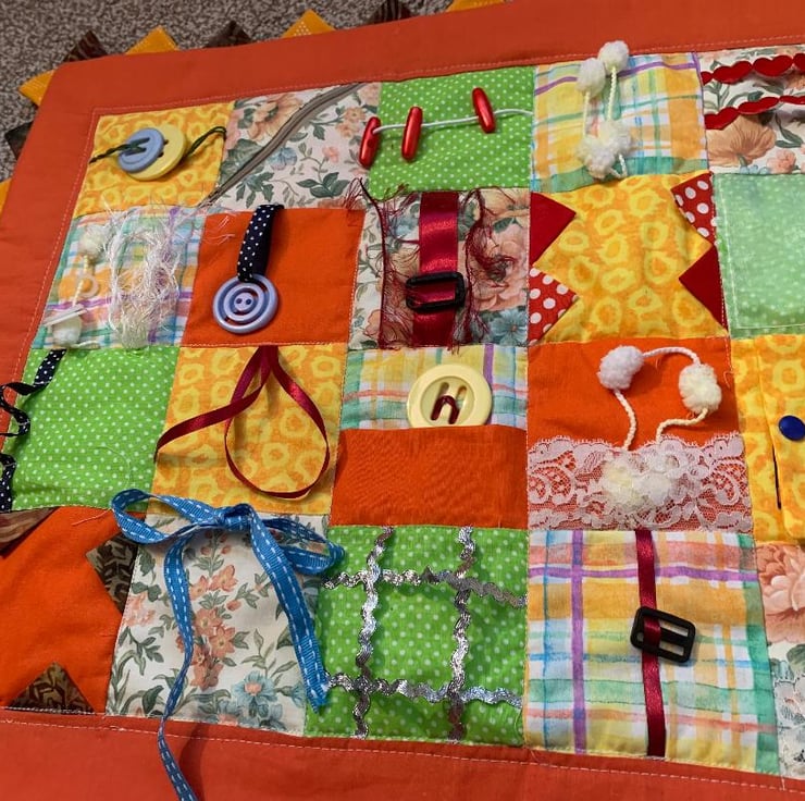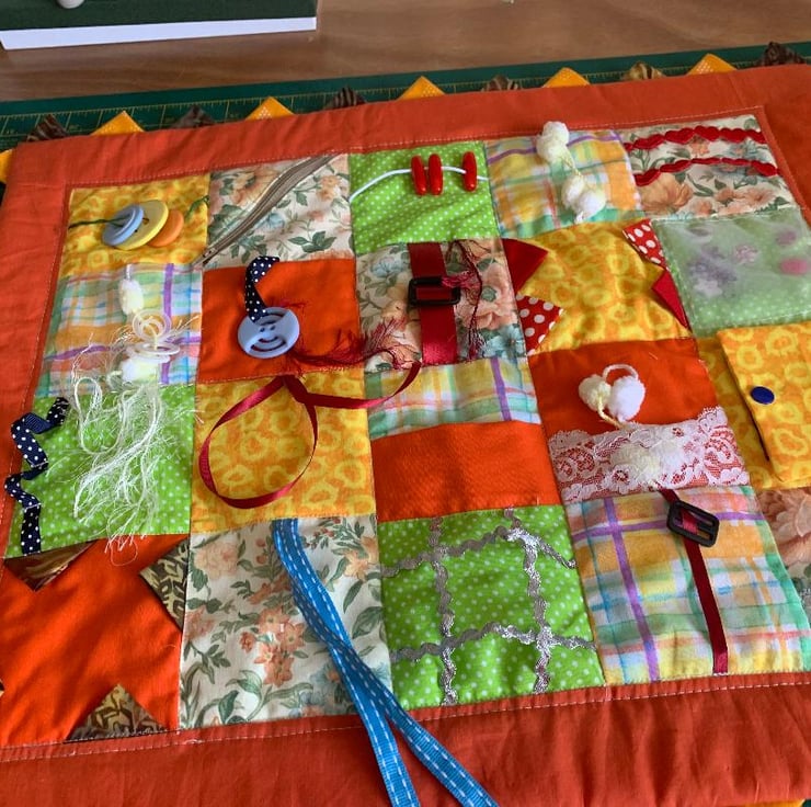 My friends mother has Dementia and finds that a fidget quilt helps her with her co-ordination and she just likes fiddling with all the tags on her Fidget quilt.