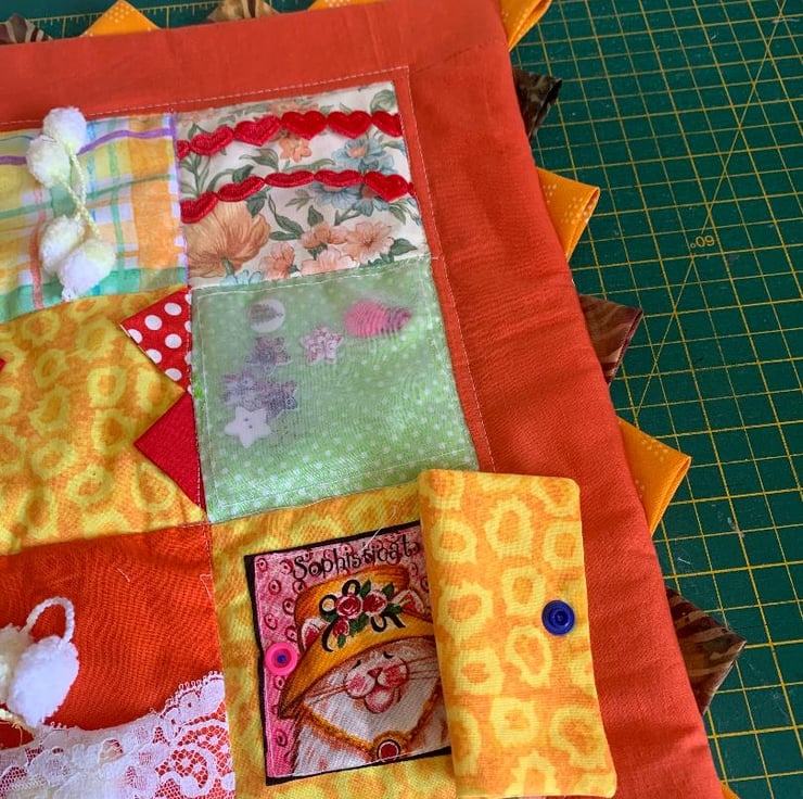 co-ordination and keep their mind occupied. It is very bright colours with tags or buttons on each square.