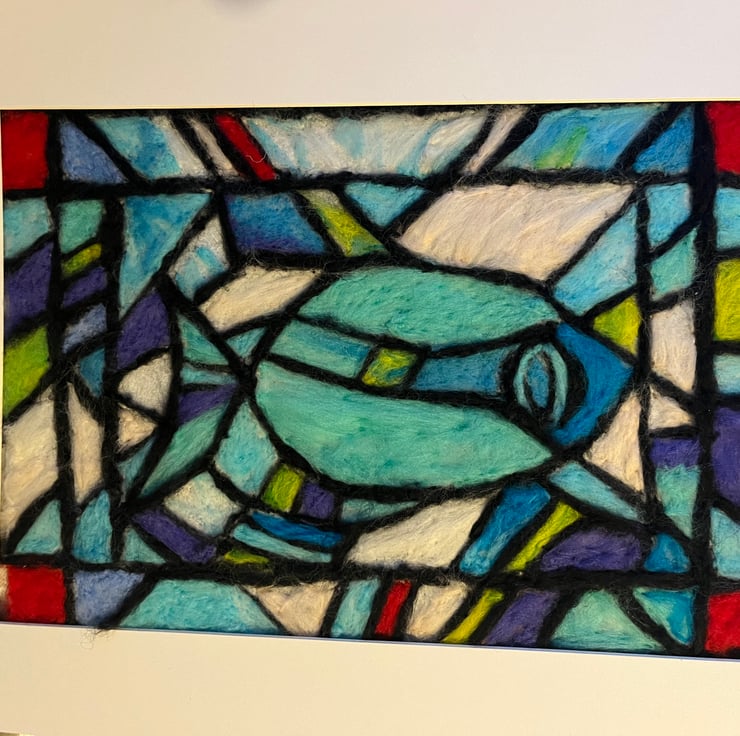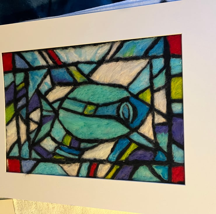 Credit to Terry Culkin original stained glass artists. A4 needle felt wool painting wall art in A3 mount.