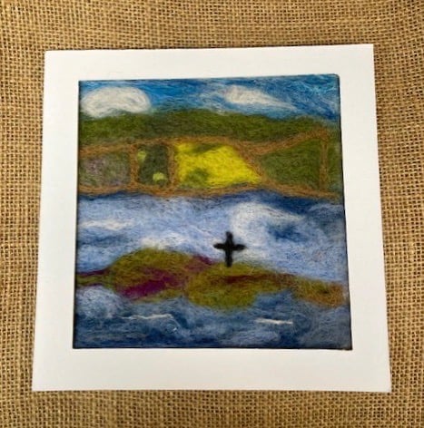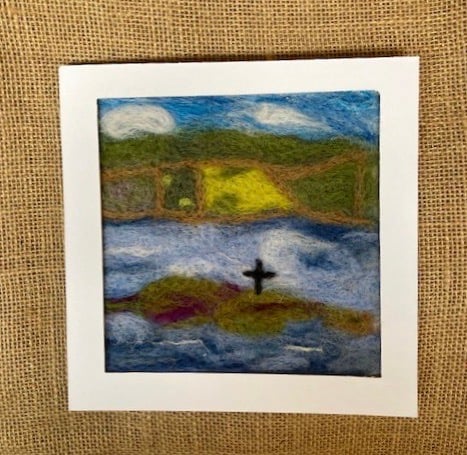 This depiction of the ethereal, spiritual holy island of St Cuthbert has been made using the needle felting process. The picture has then been surrounded by white mounting board ready for framing. The actual picture measures 15cm x 15 cm and with the mounting board the entire piece measures 19cm x 19 cm.