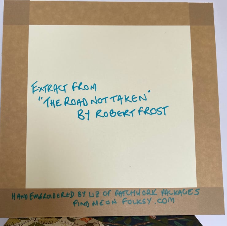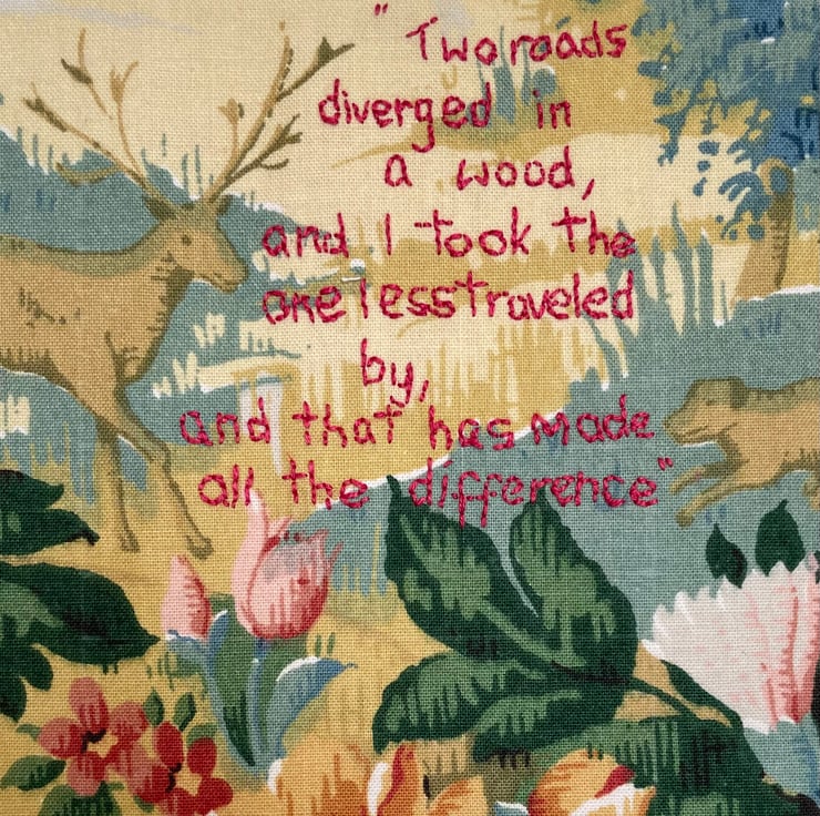 I have been experimenting with embroidered text and this quote from poet Robert Frost means a lot to me. The vintage piece of fabric is perfect fit for the words.
