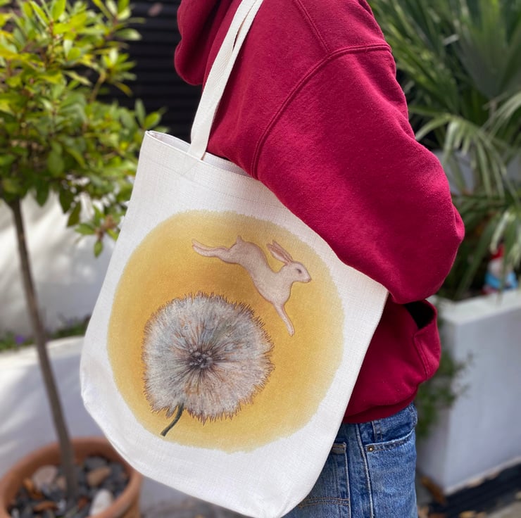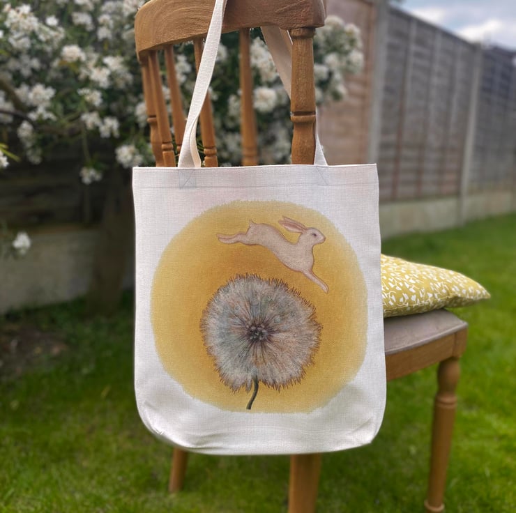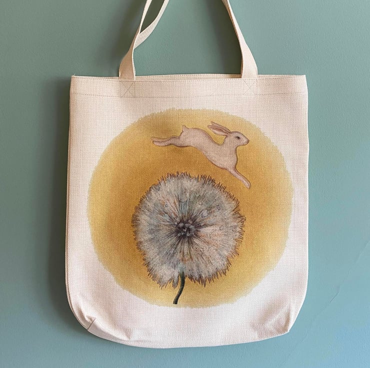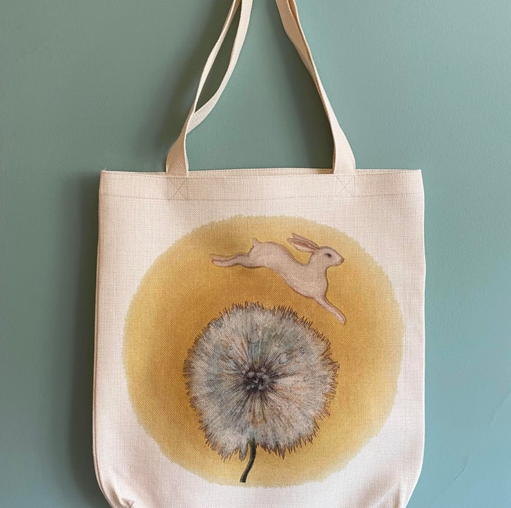 Bringing some fun and colour to shopping and outings, this bright and sunny reusable bag features my uplifting illustration of a bunny jumping over a dandelion clock.