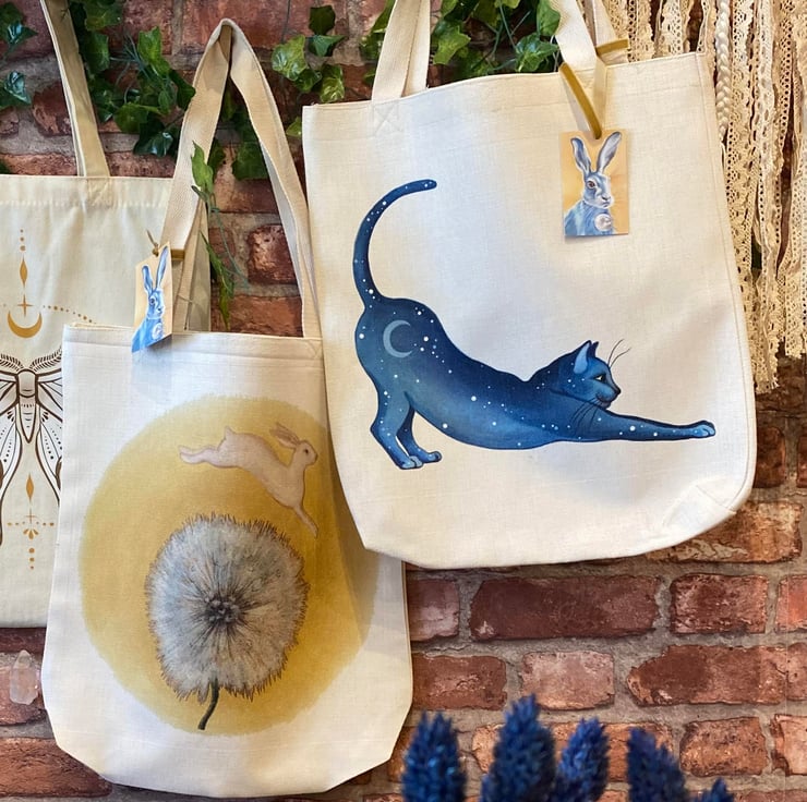The final picture shows this tote bag, along with my other tote bag - "Lunar Cat Stretching".
