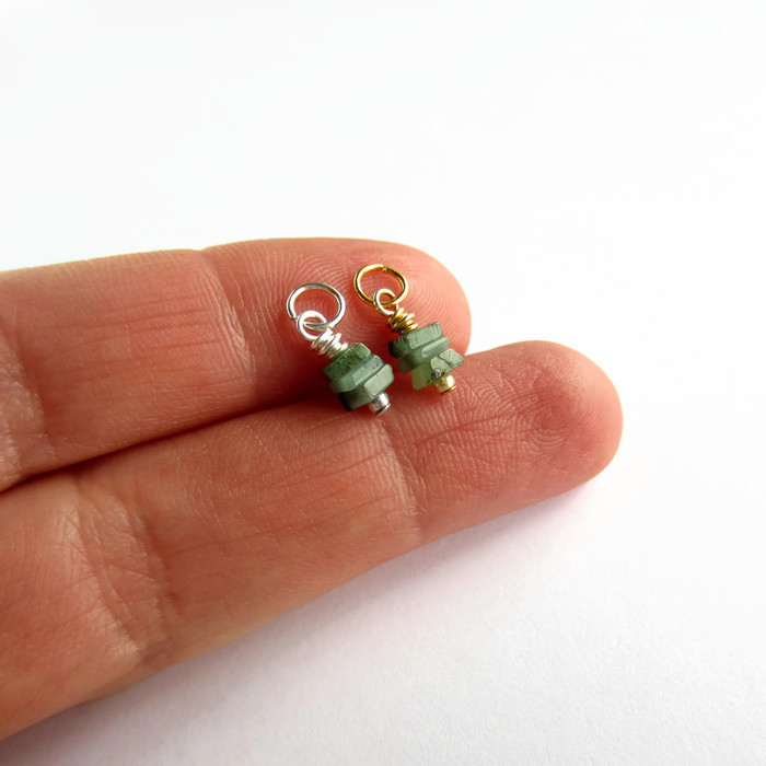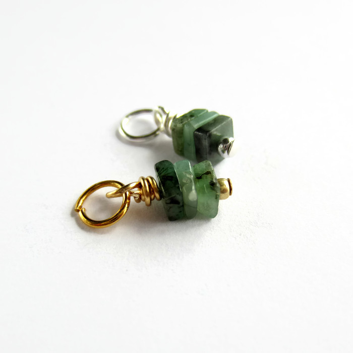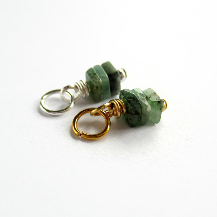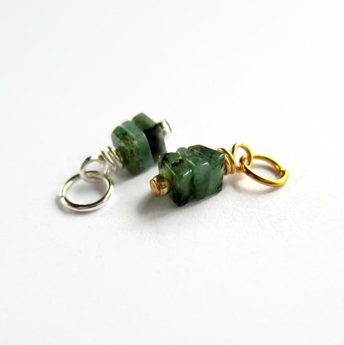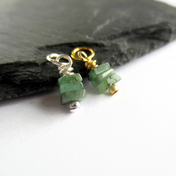 Three tiny, square cut, emerald gemstones are securely wire wrapped by hand to create a delicate stack charm or mini pendant ready for you to add to your own jewellery creations.