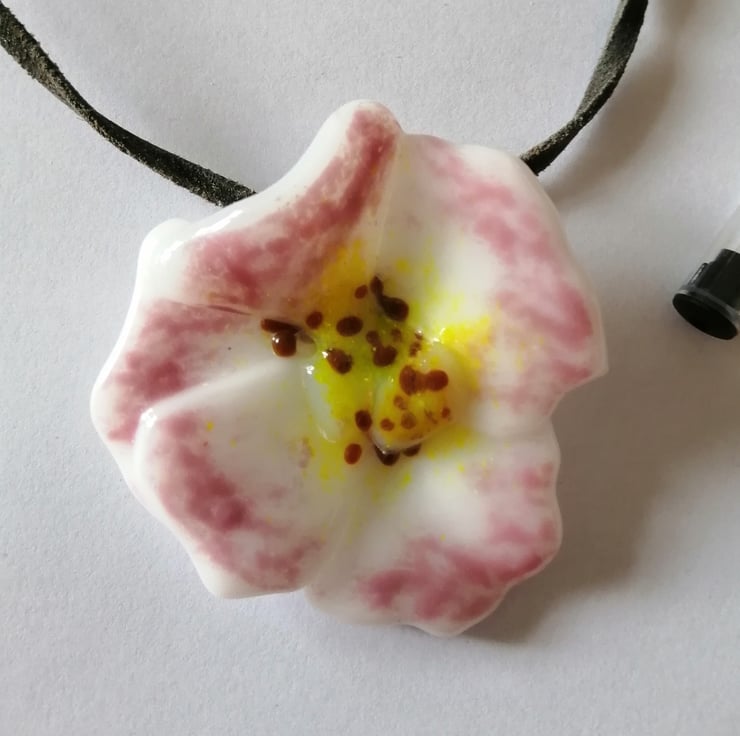 Three different rose and poppy pendants hanging on a black leather like thong with fixings approximate size 5 cm diameter