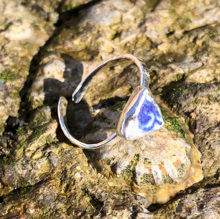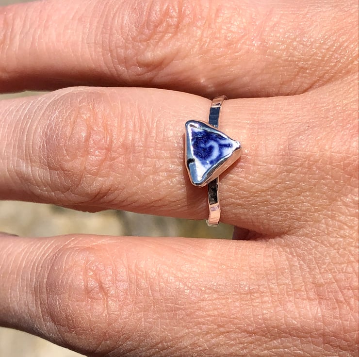 This beautiful piece of blue and white of sea pottery was found along the UK's South West coastline and has been set in a fine silver bezel (.999) with a recycled (ecosilver) sterling silver (.925) hammer textured ring. This ring has not been hallmarked.