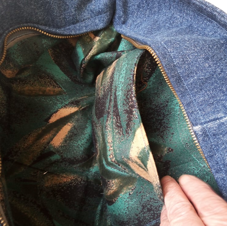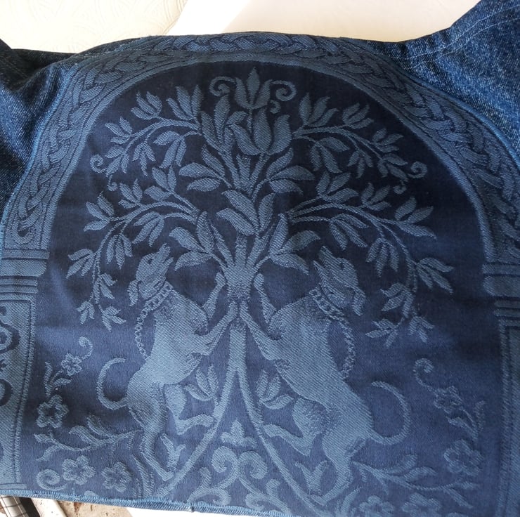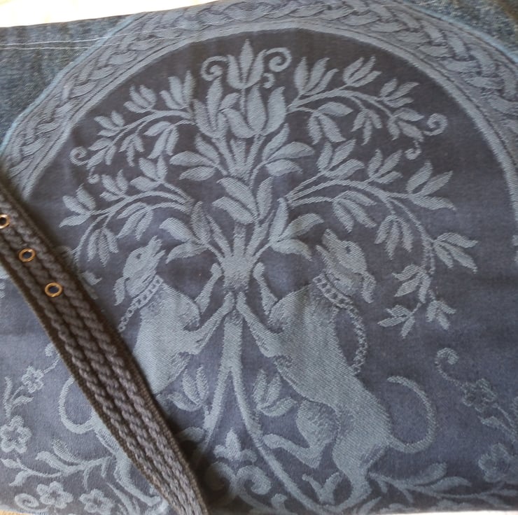 Repurposed Denim jeans with a vintage fabric of 2 dogs and belt strap with funky lining,