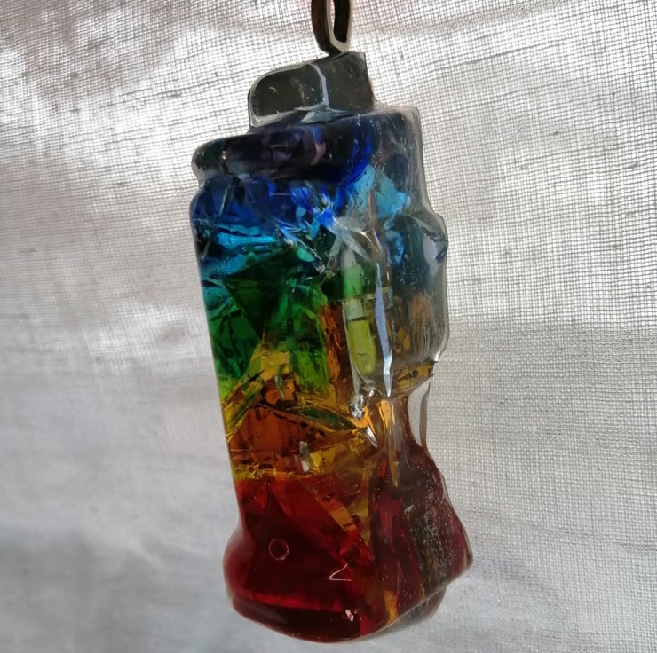 Vibrant and colourful small rainbow multicoloured glass suncatcher to add a jewel like decoration to a room sized approximately 7cm x 3 cm. A great present for someone who is difficult to buy for.
