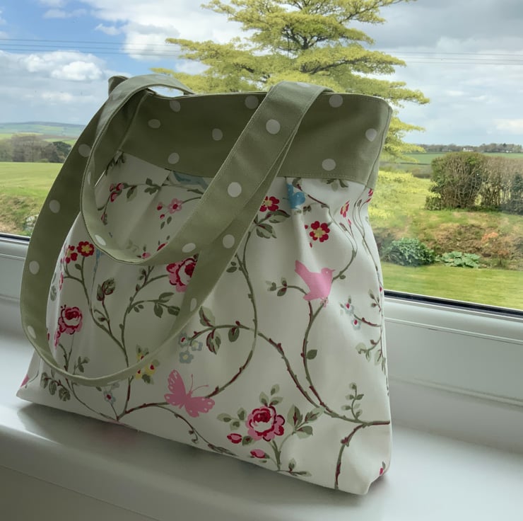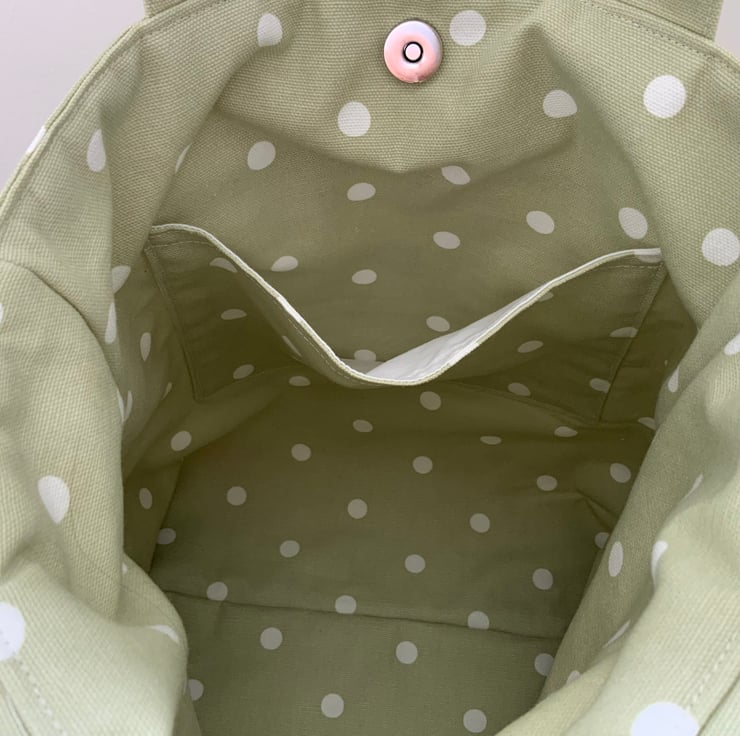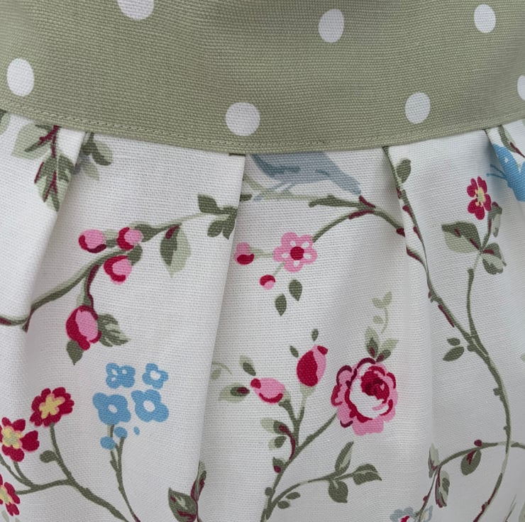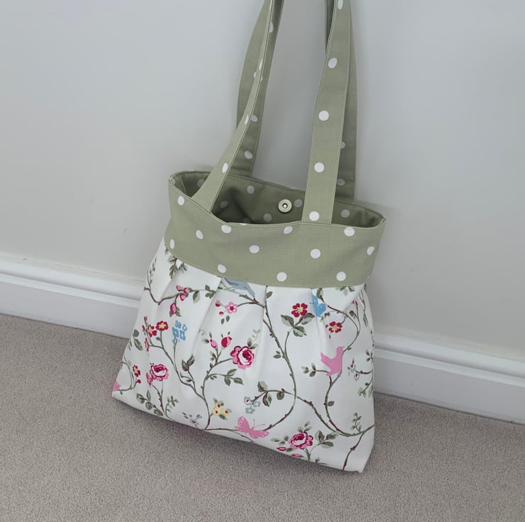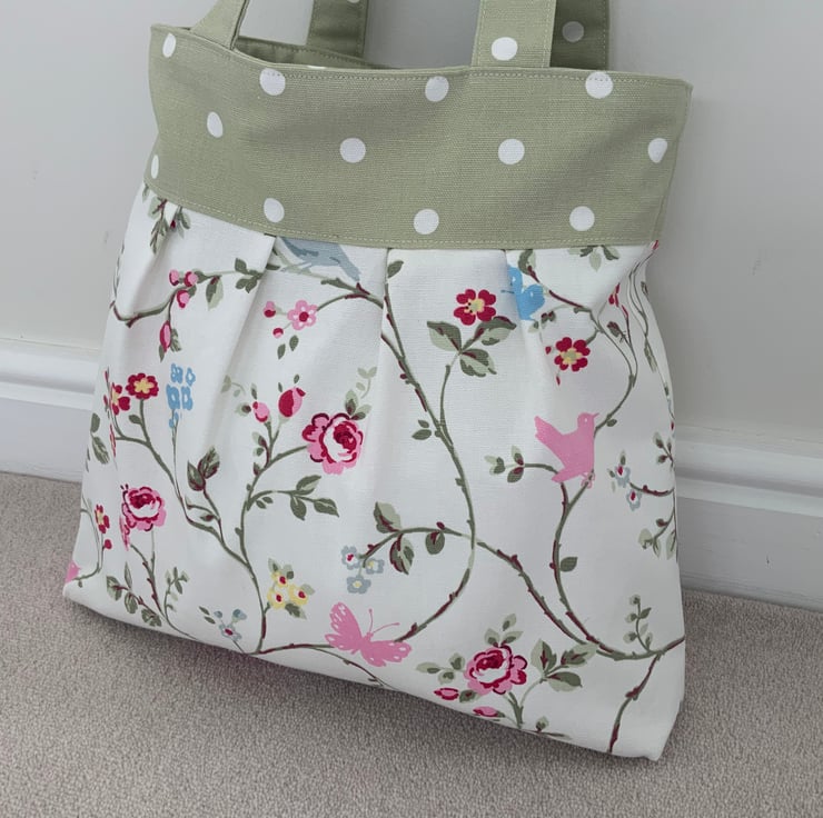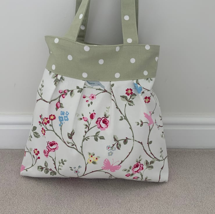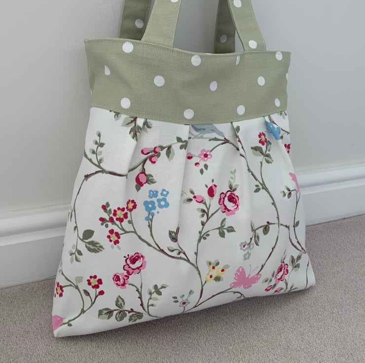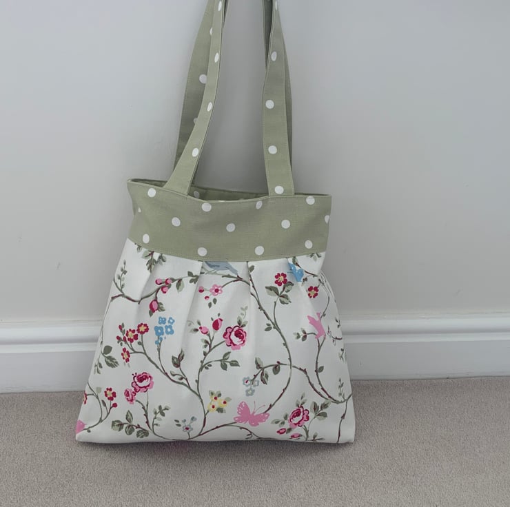Beautiful pleated tote bag. Natural coloured band at top with a pleated Laura Ashley stripe fabric beneath. Lined with natural cotton with a layer of interlining sandwiched in between to give it structure and a soft luxurious feel. Internally, it has a small slip pocket and is fitted with a magnetic snap fastener. The square bottom gives the bag extra depth.