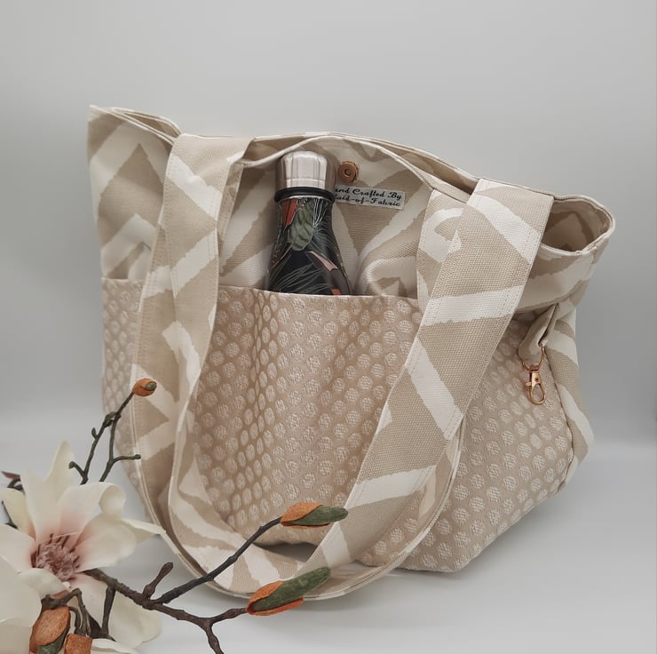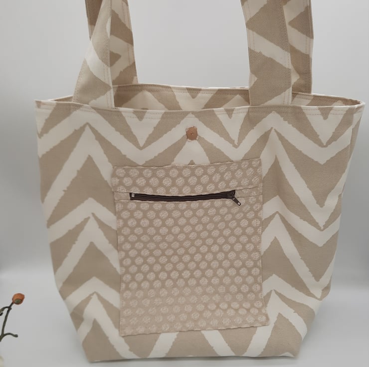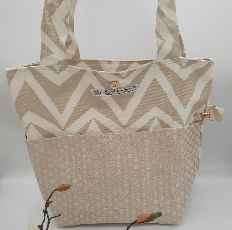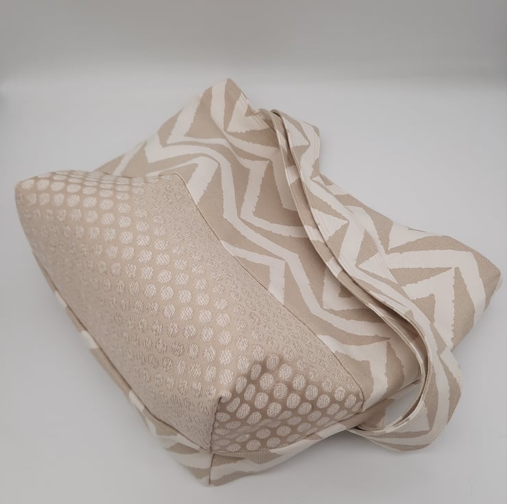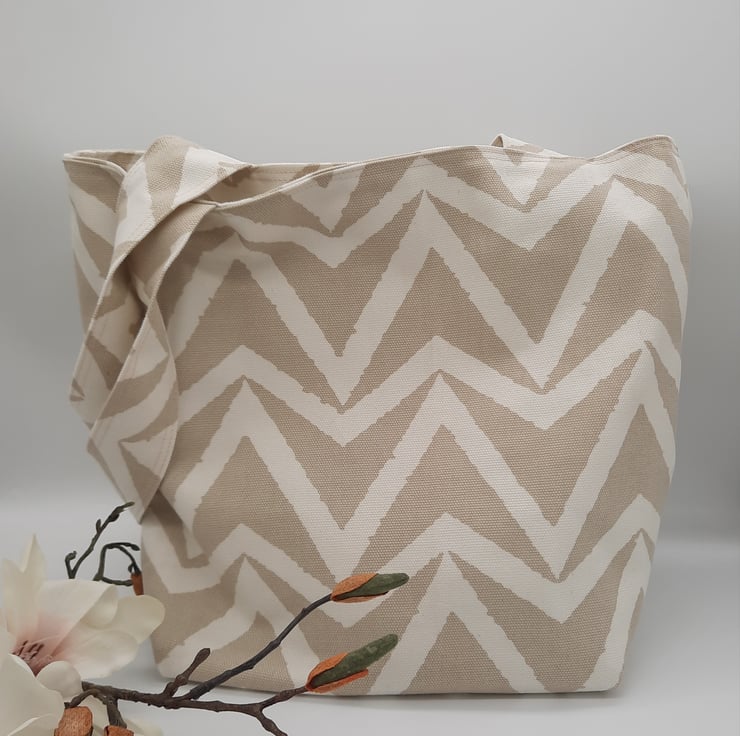 Stylish large tote bag made using a quality white and sand chevron fabric.