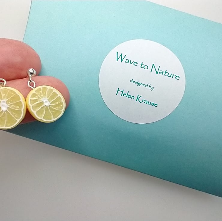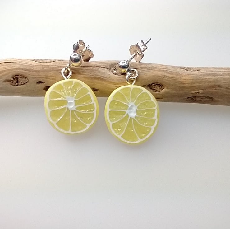 These juicy lemon slices look so real and are handmade from polymer clay. They are fun earrings that hang from sterling silver studs (pierced) or clip-ons (non pierced). They look great for Spring and Summer with a fresh lemon or white top with jeans and also with other fresh citrus colours.