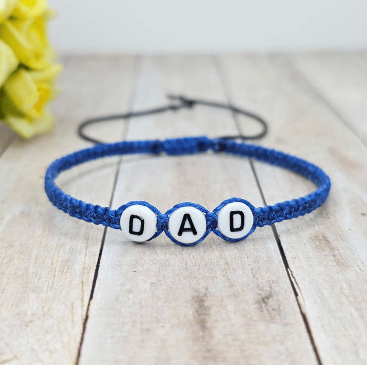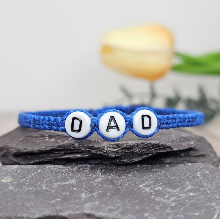 This beautiful "DAD" charm bracelet is made from high-quality Brazilian waxed cord – resistant to fraying and ultraviolet exposure. It is also washable and the vibrant colours do not run.