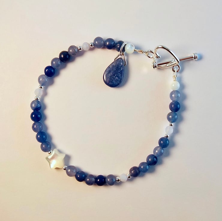 Dainty Blue Aventurine bracelet featuring a beautiful 12mm Kyanite teardrop, an 8mm iridescent Mother of Pearl star, and four 3.5mm faceted Chalcedony beads in a delicate pastel blue.