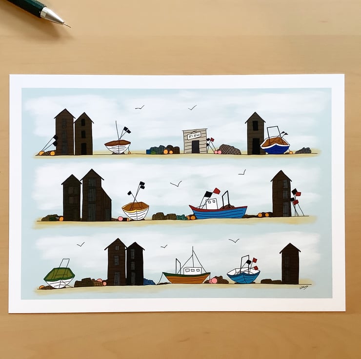 Fishing huts and boats - high quality open edition print from my digital illustration.