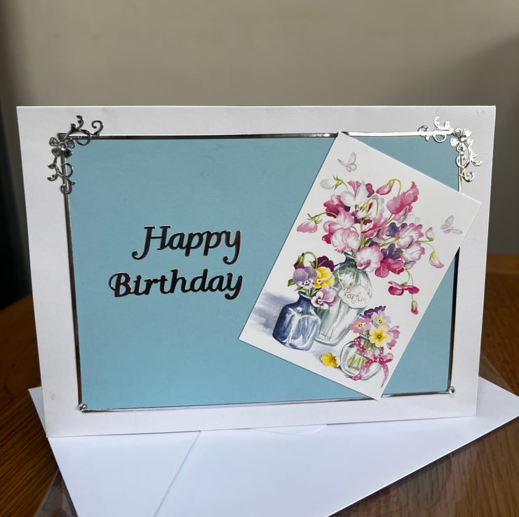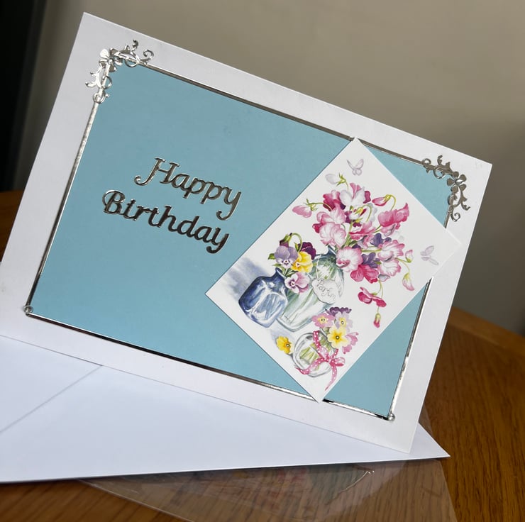 Sweetpea flower theme with happy birthday wishes card with silver trim.