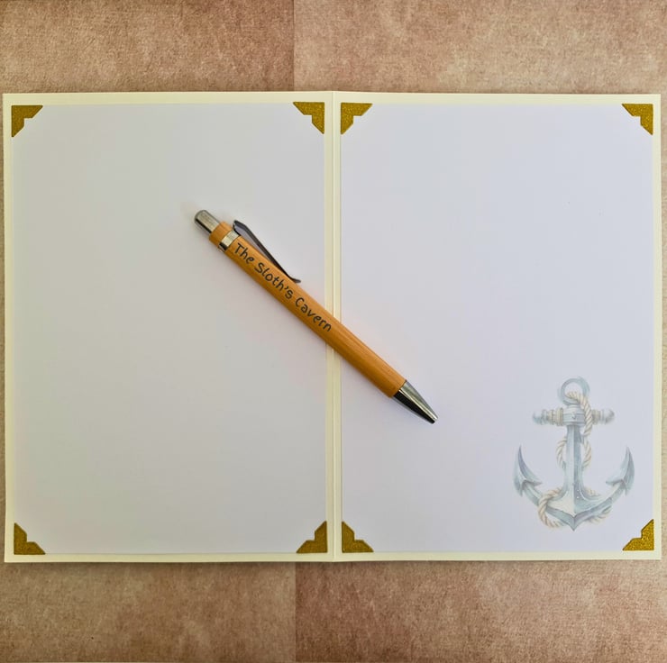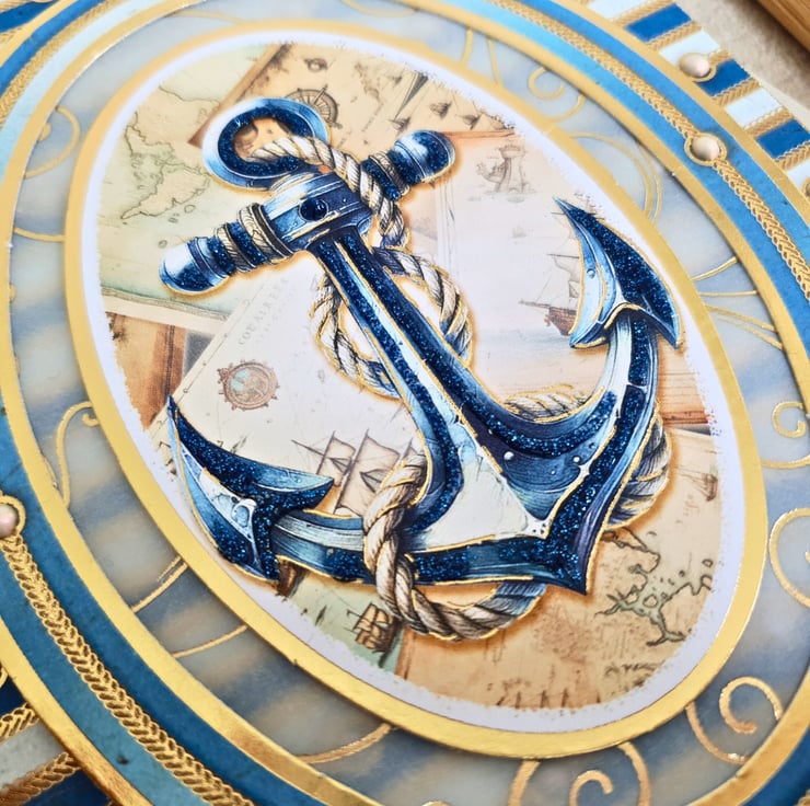 A handmade, nautical themed birthday card, displaying the image of an anchor, symbolising stability & safety.