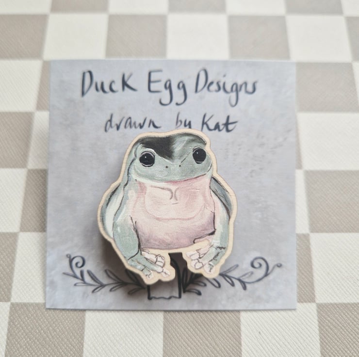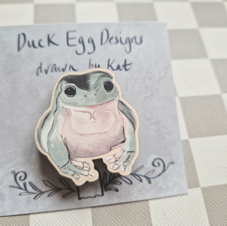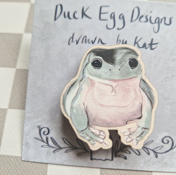 Friendly frog pin badge illustrated by me and made in the UK using FSC certified wood.