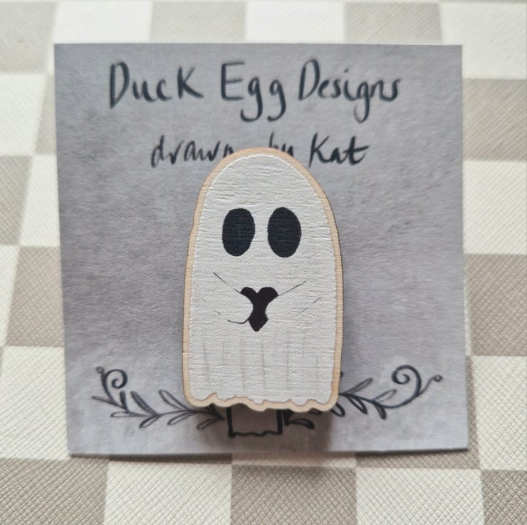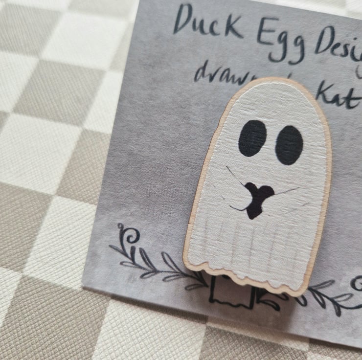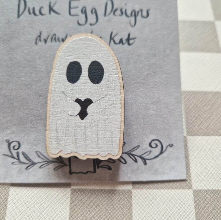 Wooden pin badge featuring a ghost hugging a dark red heart. Illustrated by me and made in the UK using FSC certified wood.